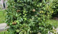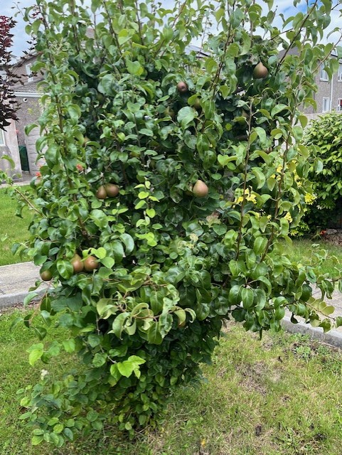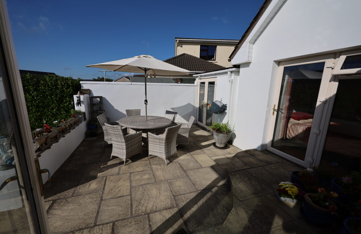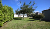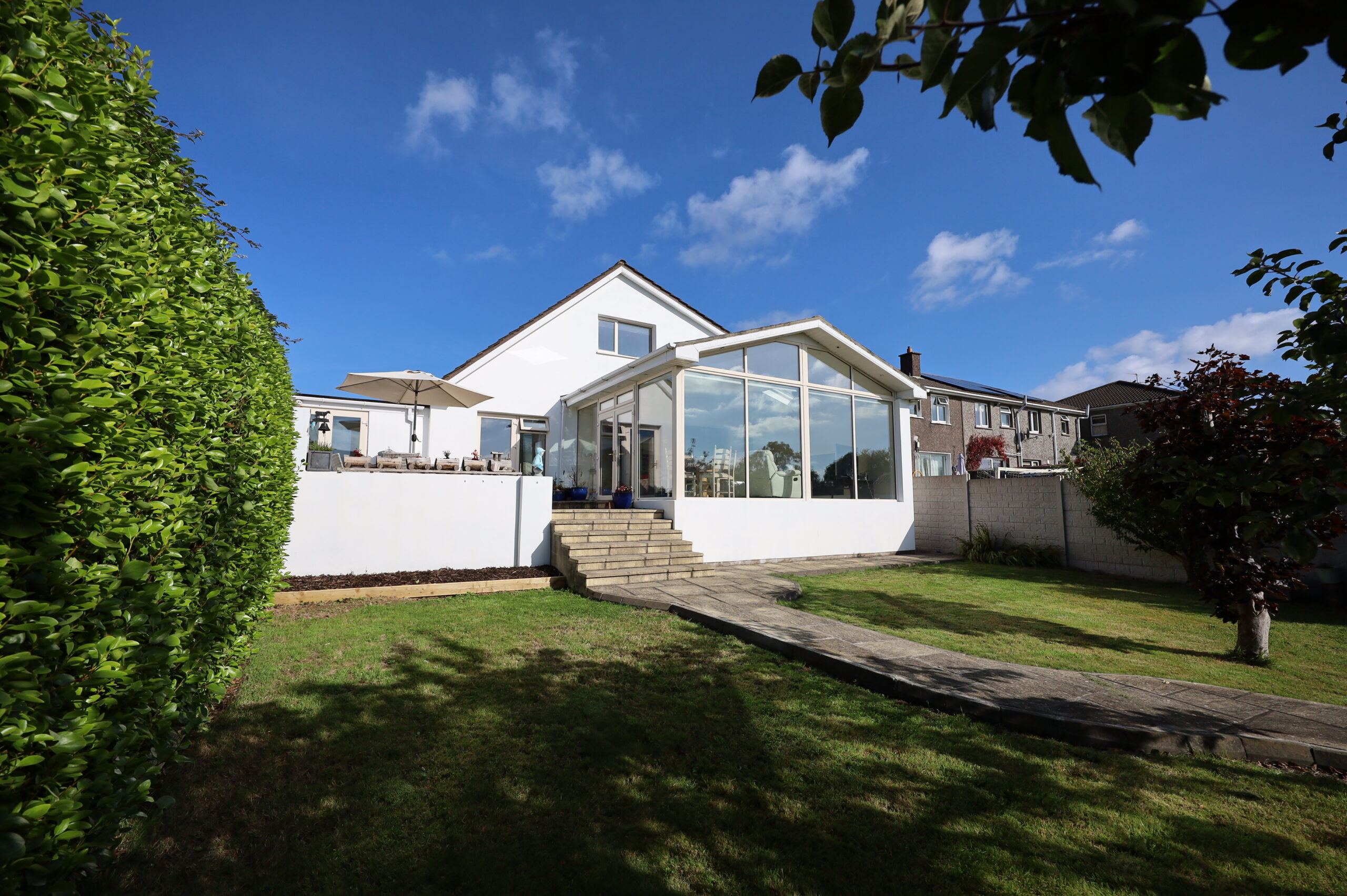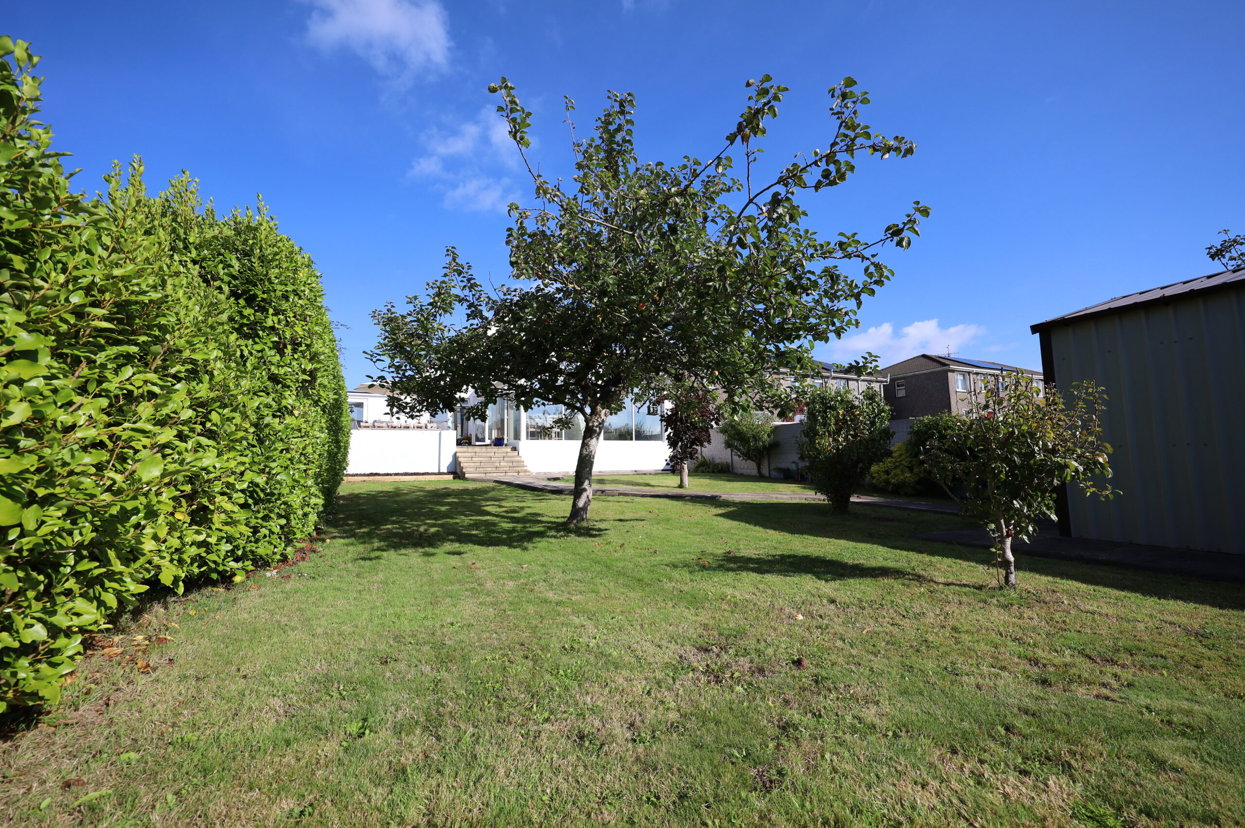 The spacious lawn is enhanced by mature fruit trees, complemented by an attractive mix of shrubs and plants, creating a charming and private outdoor setting. Side access with gate adds convenience, while the fully enclosed front garden features a concrete driveway, lawn, shrubbery, and extensive parking with ample turning space. Elegant brick pillars frame the entrance.