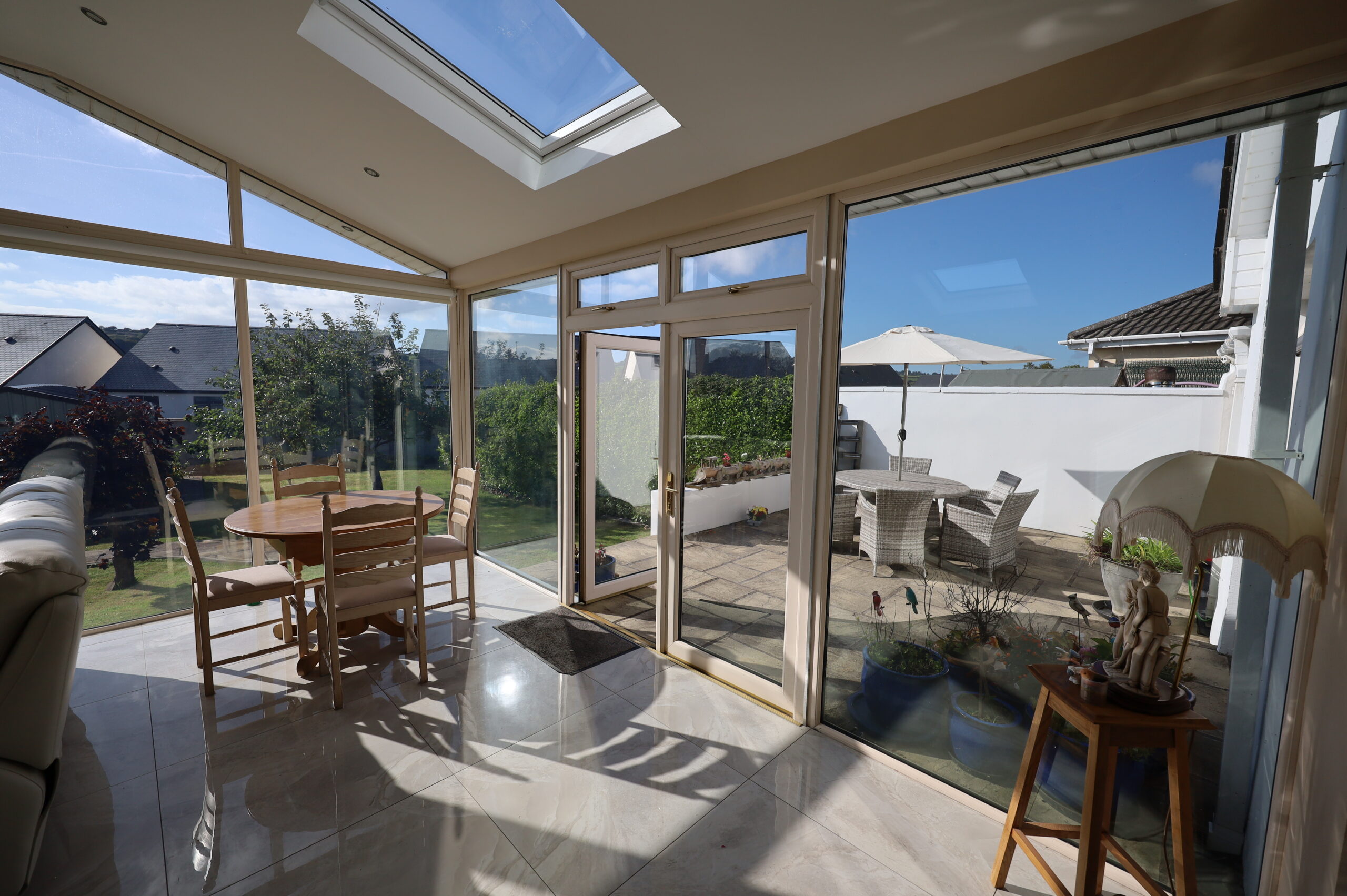 Solid maple flooring. Double glazed door and glass panel to patio.