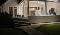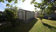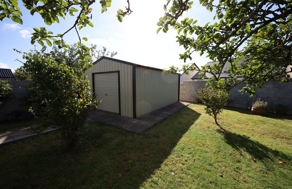 A beautifully designed modern sandstone patio with elegant steps leads down to a large garden. A sandstone pathway brings you to the impressive Steeltech garden shed (6m x 4m), complete with roller shutter door and surrounded by sandstone flags. To the rear of the shed, a discreet shingle area provides practical space for clothes drying and bin storage, neatly tucked away from view.