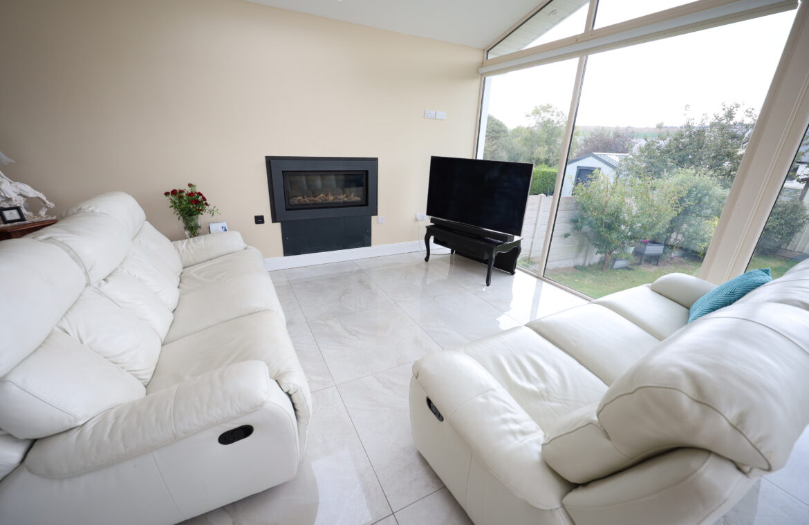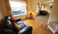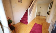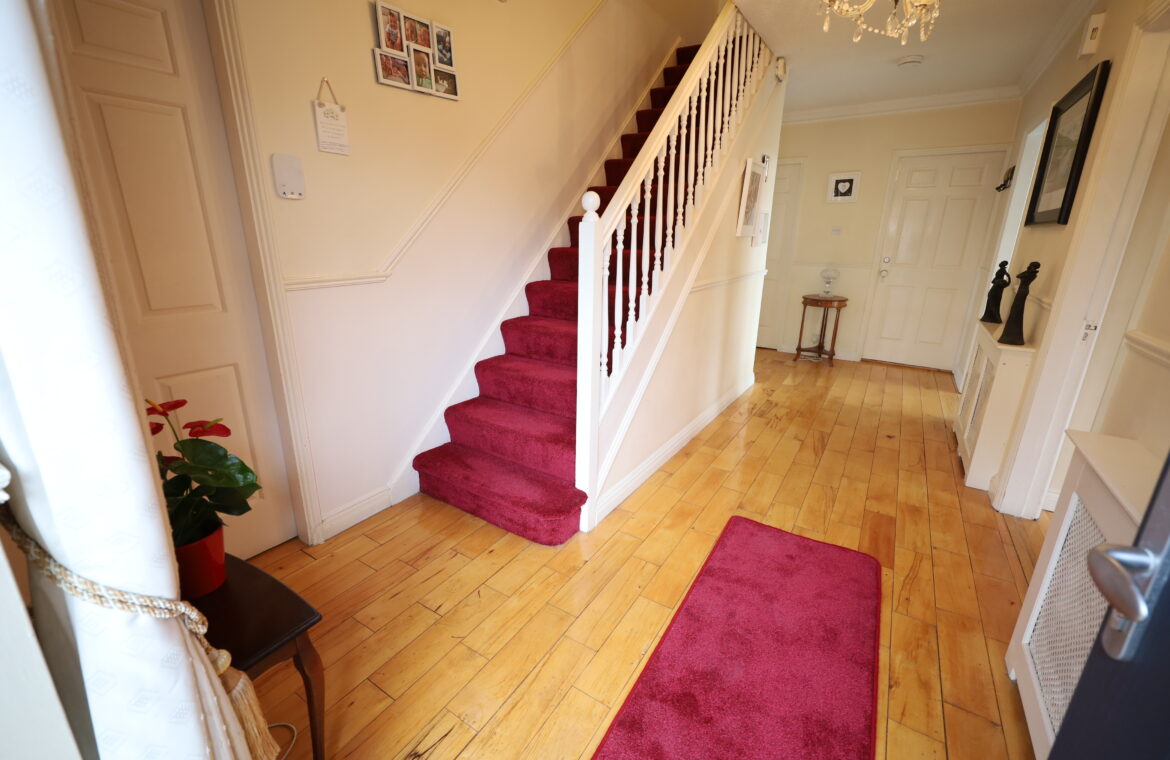 Recently fitted, insulated, composite PVC front door with contemporary glass and matching glass side panel to large reception hall. Reception hall with maple flooring. Carpeted stairs to first floor. Spacious cloaks under stairs. Corniced ceiling with centre rose. Decorative radiator covers.