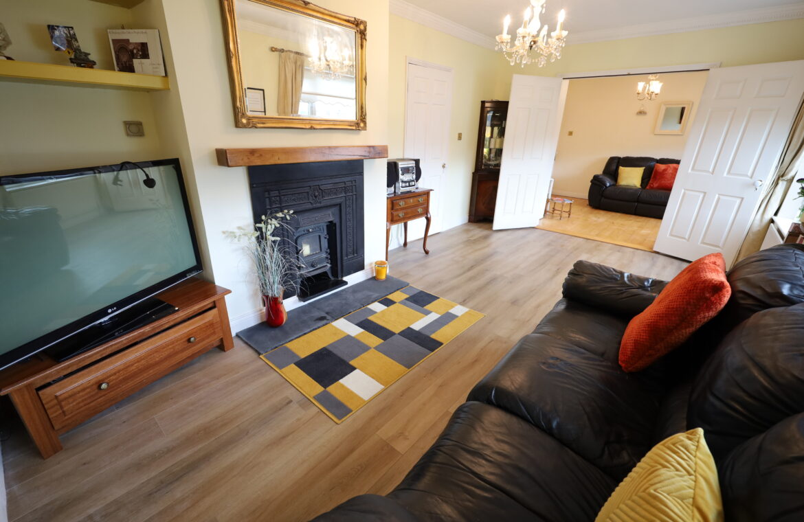Quality laminate floor. Fireplace ope with cast iron stove and decorative surround. Granite hearth. Corniced ceiling. Double doors to dining room.