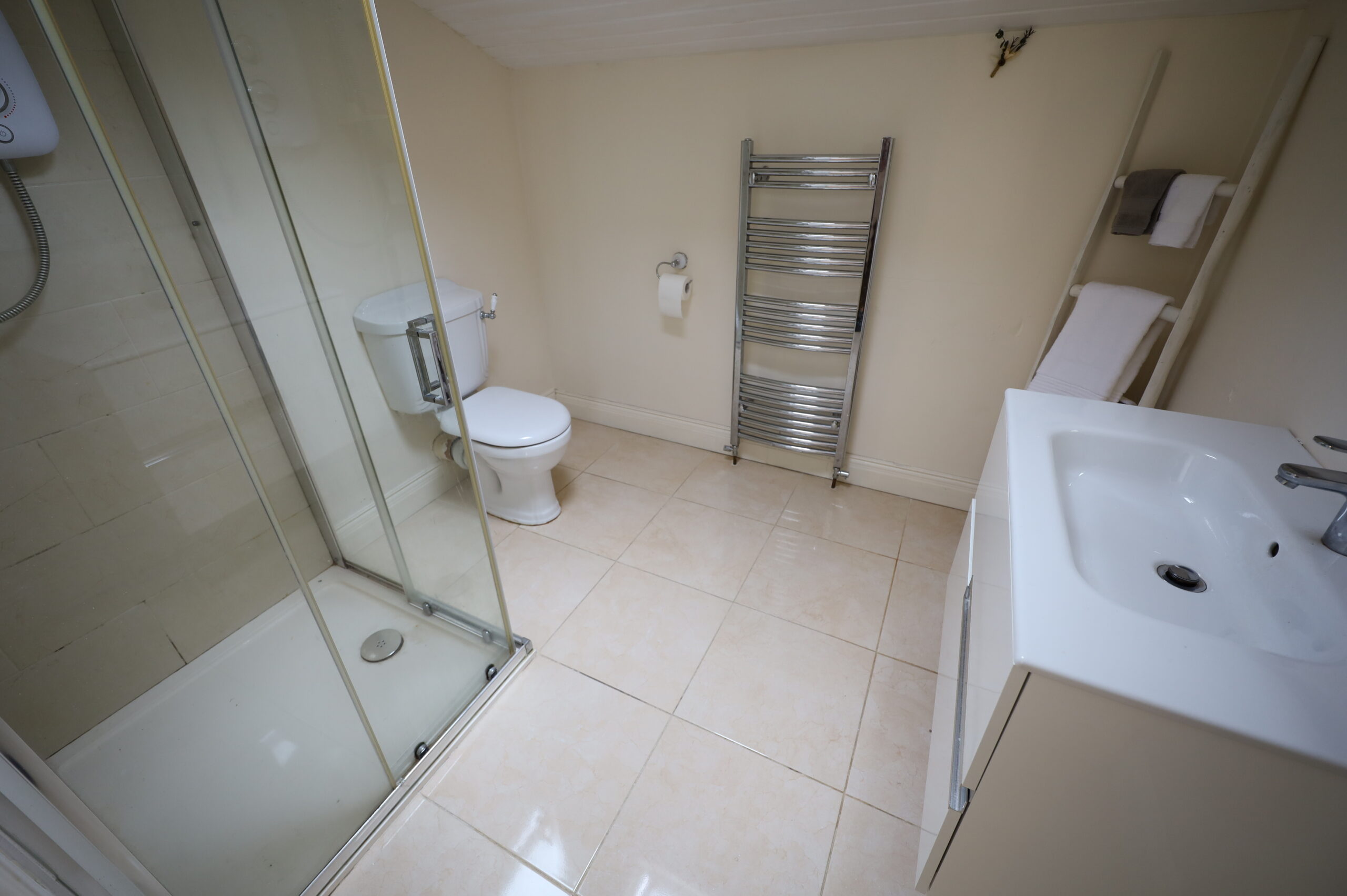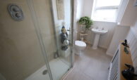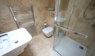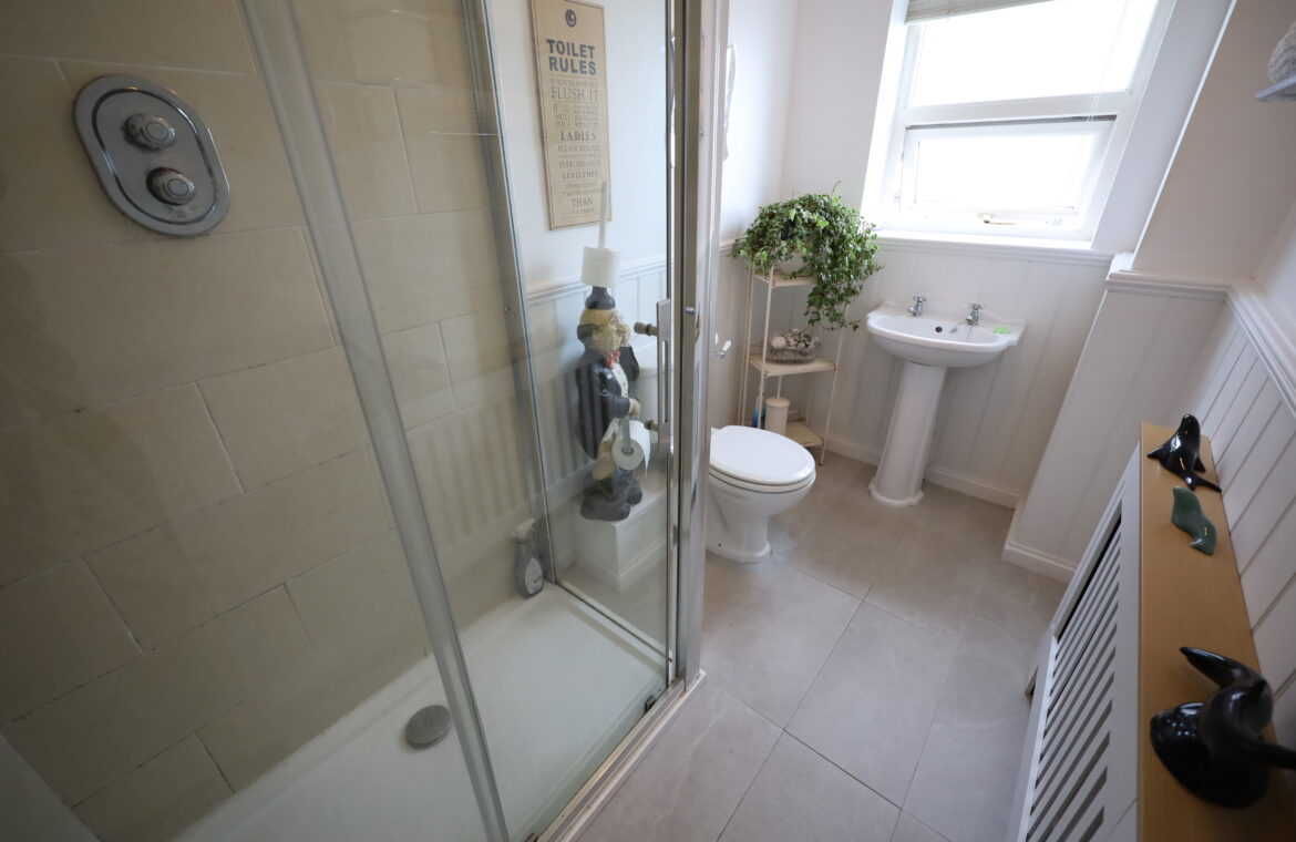 Downstairs Shower Room (off hall) double sized shower enclosure with glass sliding doors and tiled walls. White suite of toilet, wash hand basin and pedestal. Ceramic tiled floor.
