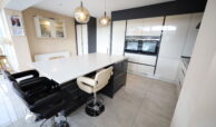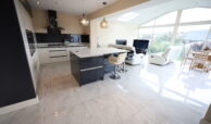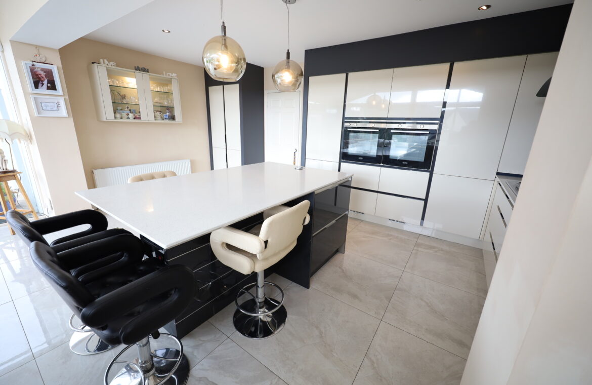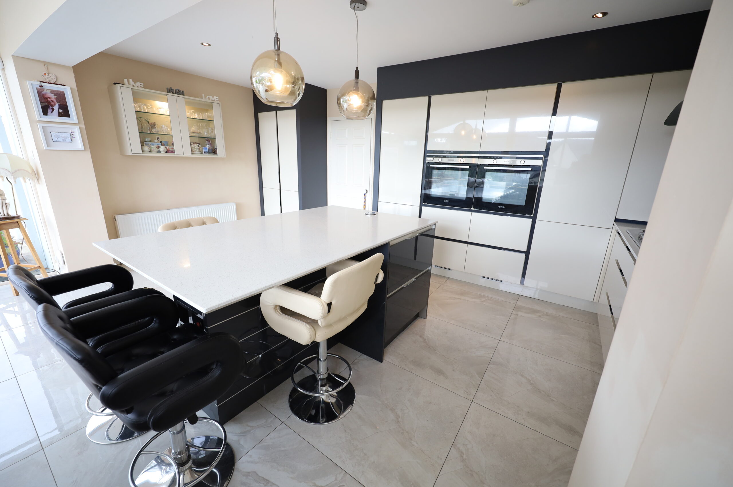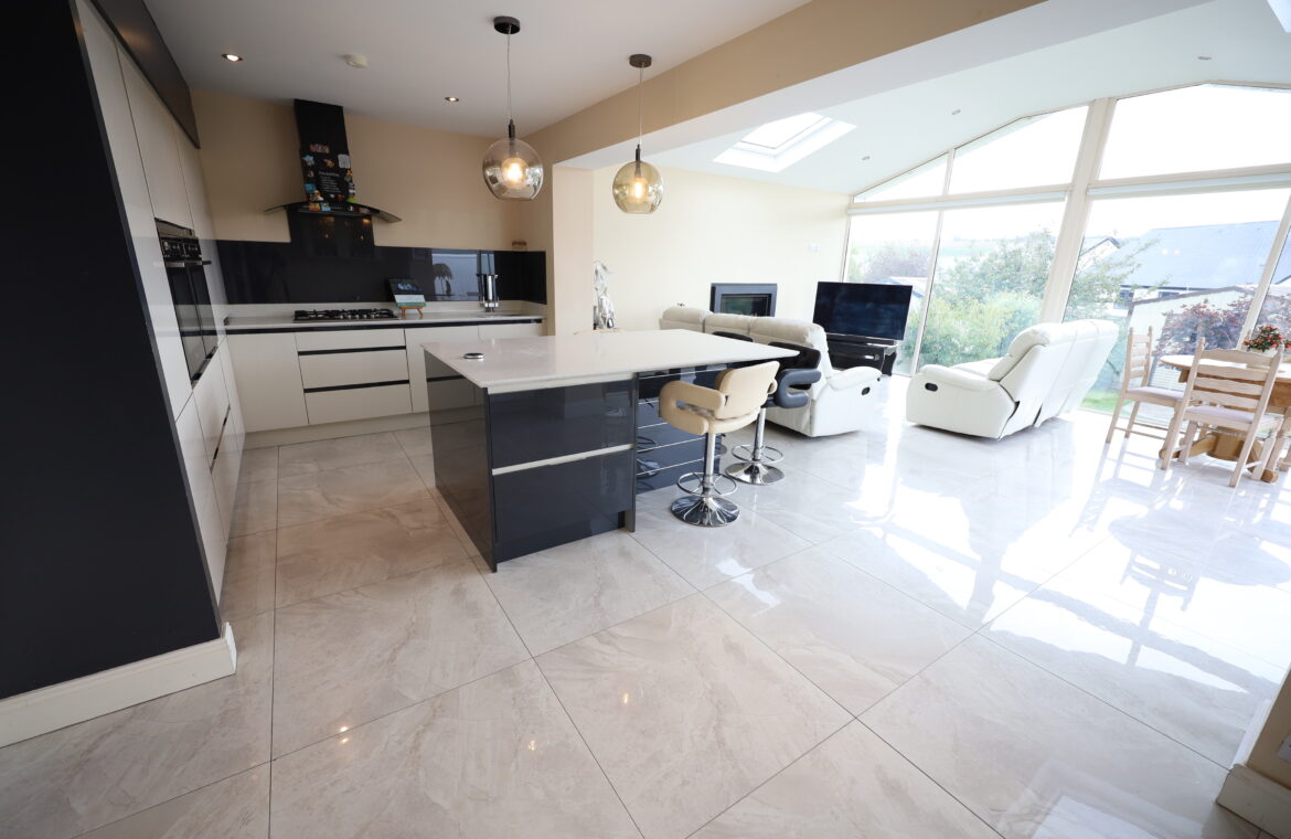 Beautiful ceramic tiled flooring throughout. Stunning contemporary kitchen with large array of base and wall mounted units quartz worktops throughout and including twin eye level ovens, integrated fridge-freezer., five ring stainless steel gas hob, under mounted stainless steel sink, integrated dishwasher, glass splashback. Large breakfast Island with quartz countertop and extensive storage. Stack style extractor hood with glass canopy. Separate storage and display cabinets.