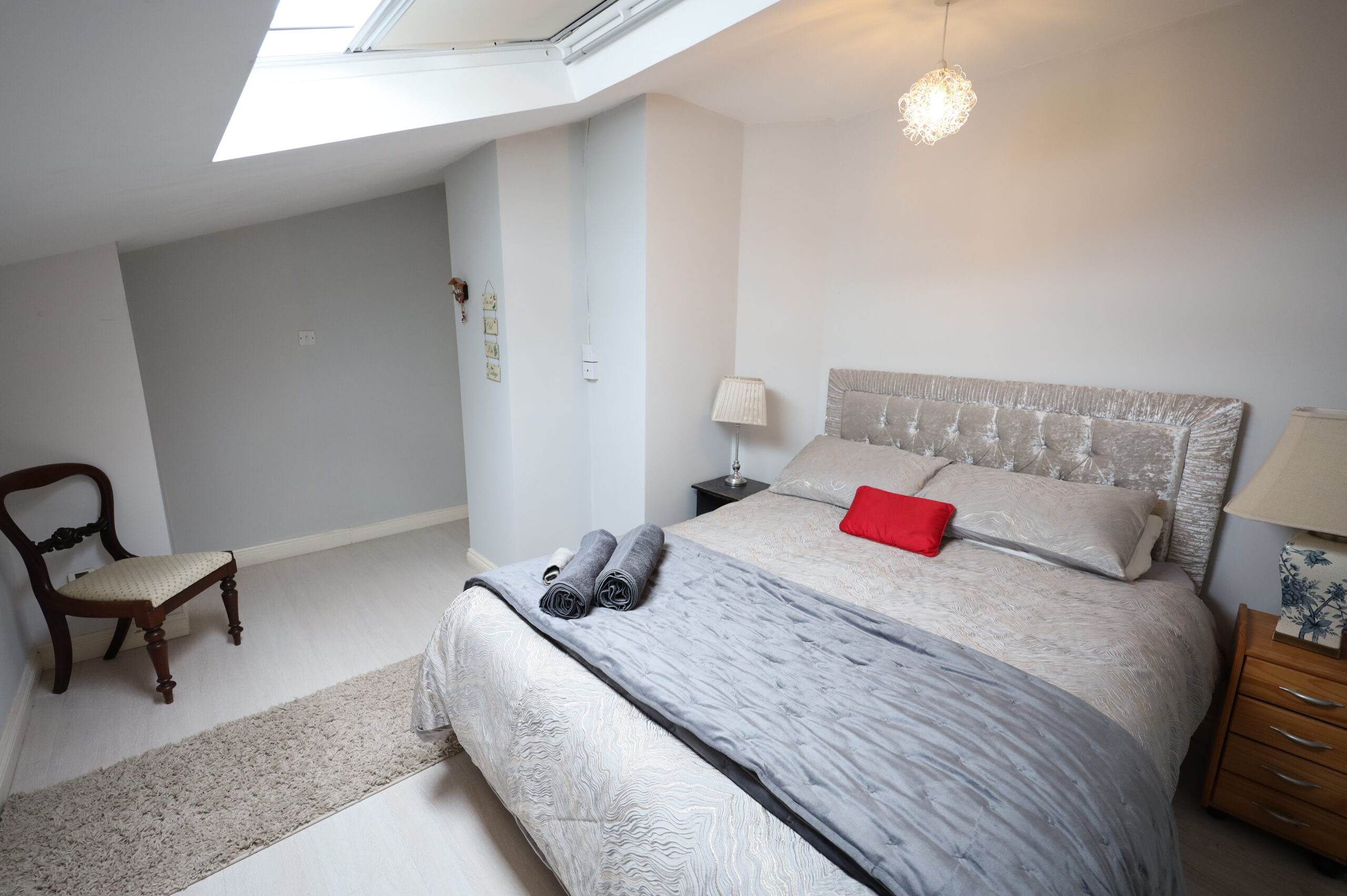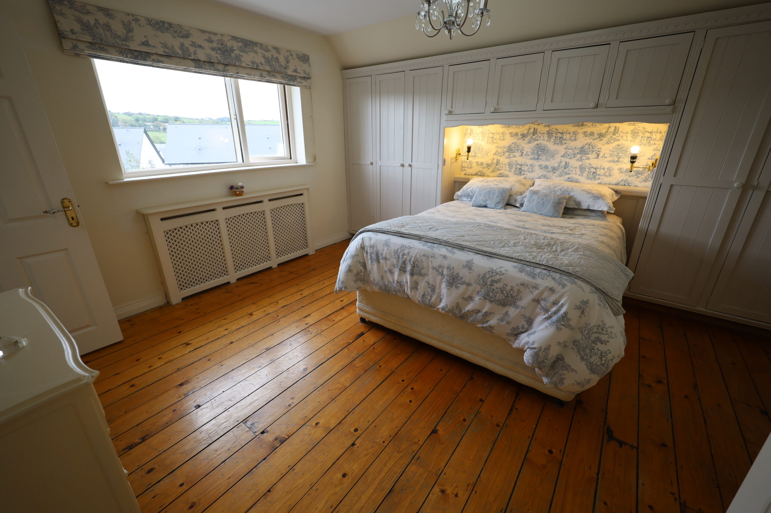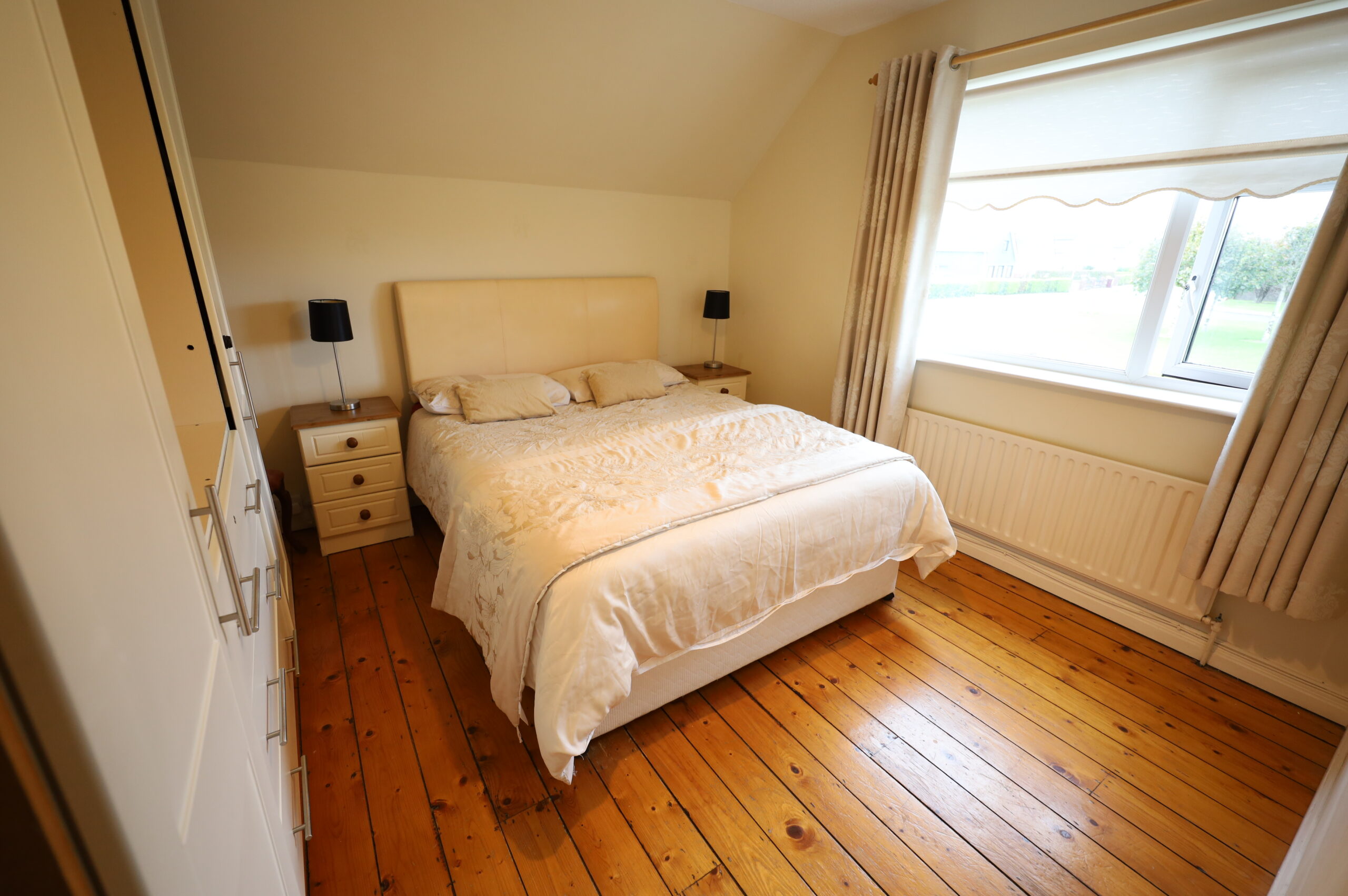 Pine varnished flooring. Two single wardrobes and chest of drawers included.