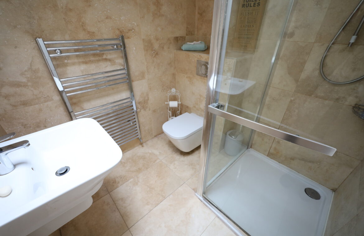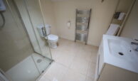 Tiled floor with tiled walls throughout. Modern suite of wall mounted toilet with concealed cistern, wall mounted wash hand basin with mono block chrome tap. Shower enclosure with tiled walls and electric shower unit.