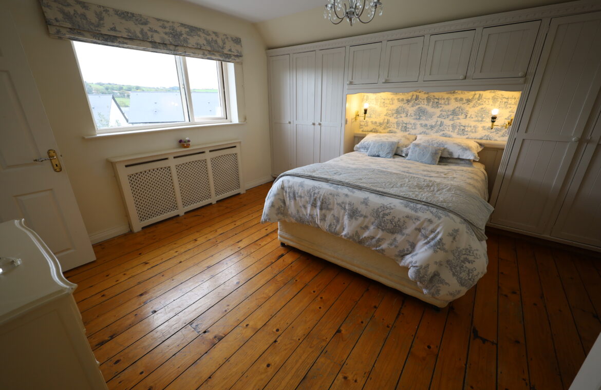 Pine varnished flooring throughout. Extensive fitted wardrobes, two doubles and two singles. Large ensuite off.