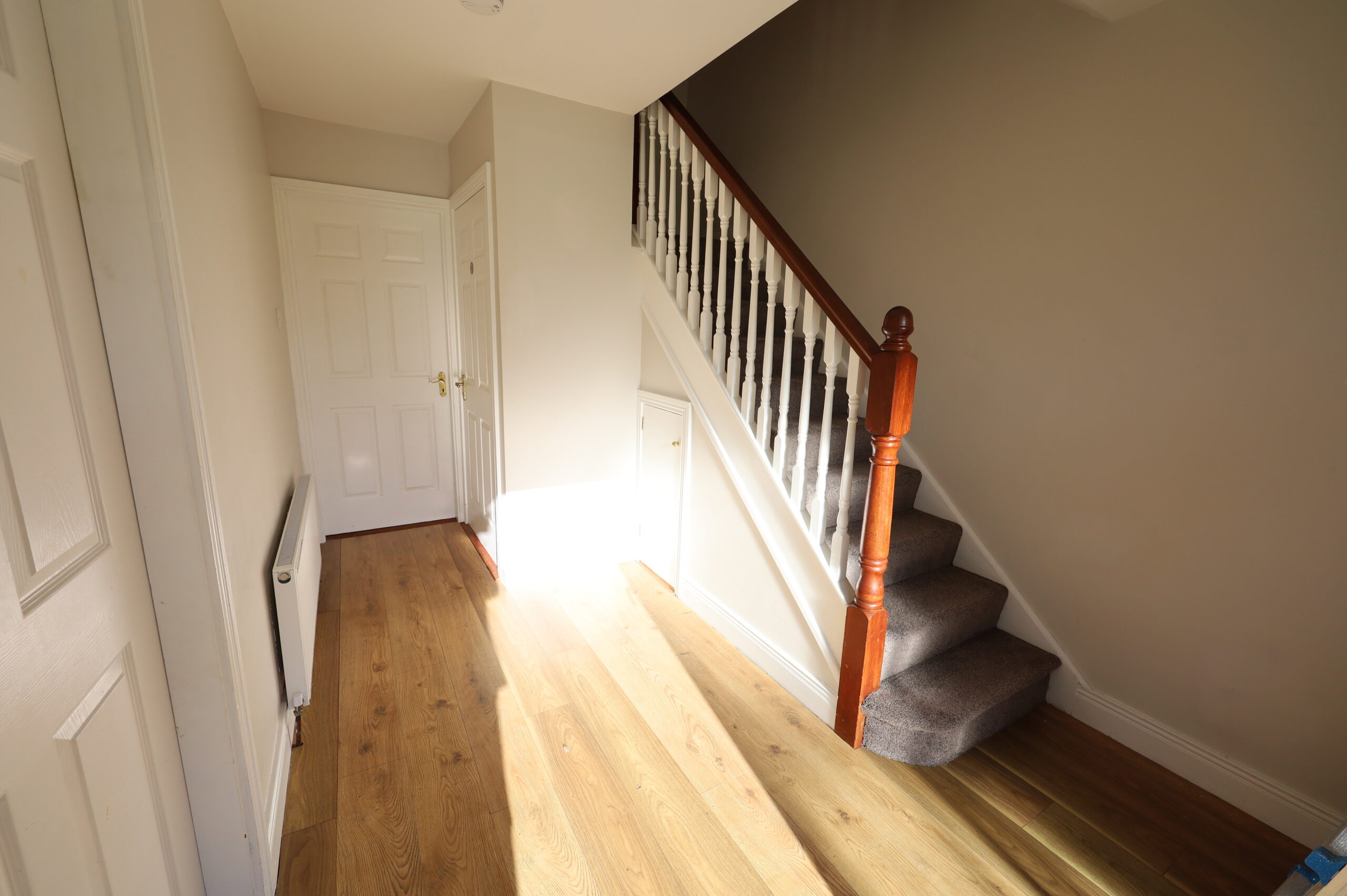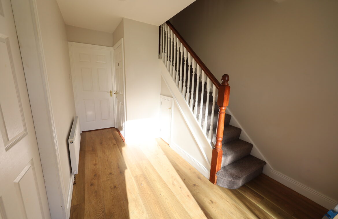 Teak front door and double glazed side panel to large reception. Reception hall with quality laminate flooring. Carpeted stairs to first floor. Storage closet under stairs. Guest W.C.