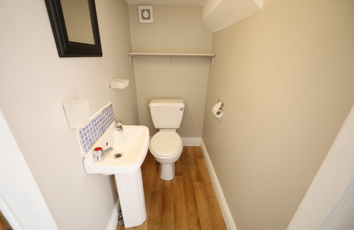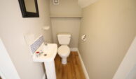 Spacious W.C. with vinyl flooring. White suite of toilet, wash hand basin and pedestal with tiling over.