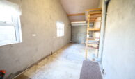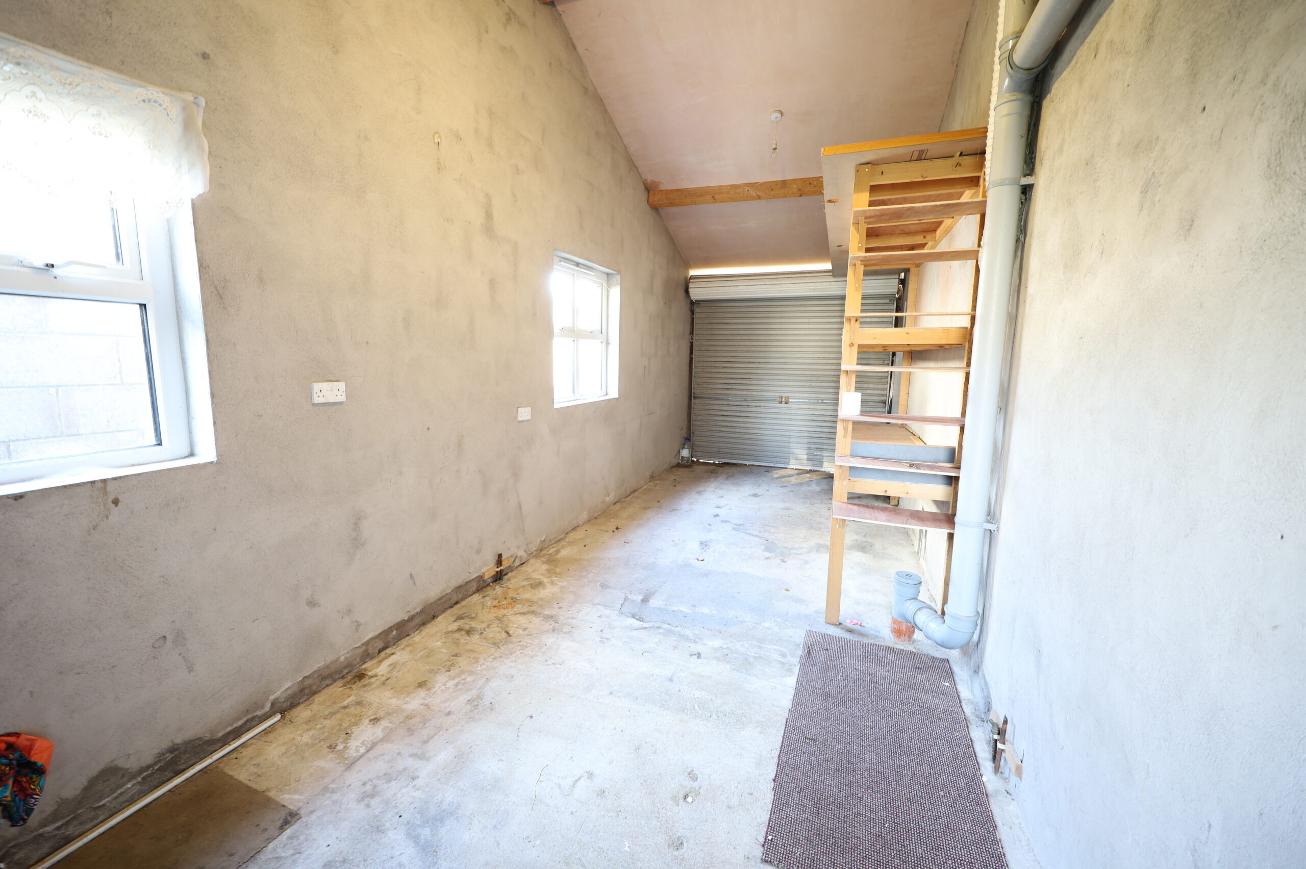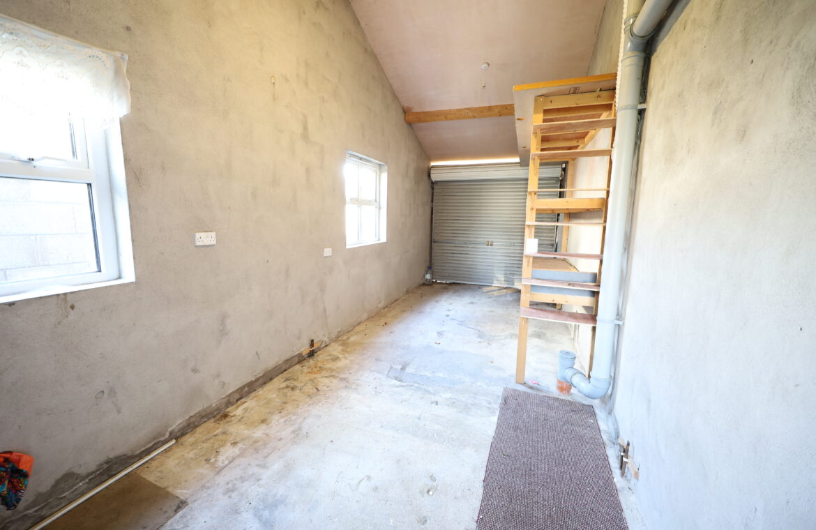 Vaulted, plastered ceiling in line with roofline. Roller shutter door. Housing modern boiler.
