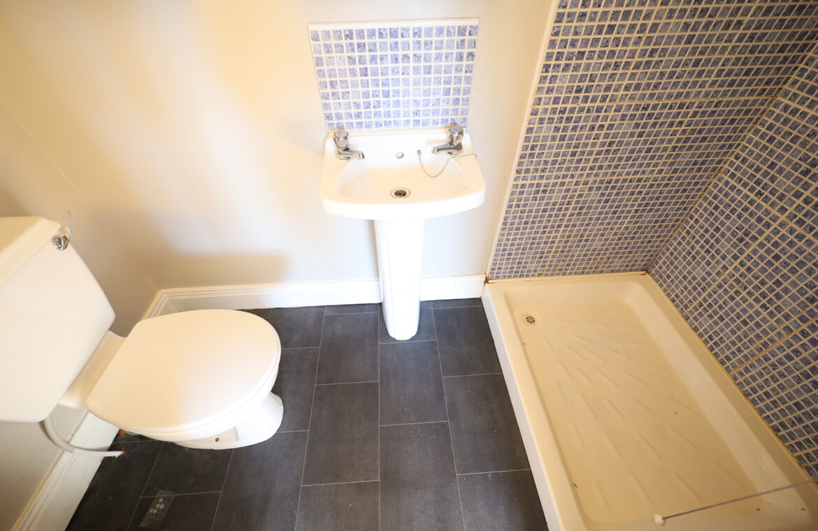 Spacious ensuite with vinyl flooring white suite of toilet, wash hand basin and pedestal. Shower enclosure with mosaic tiling and electric shower unit.