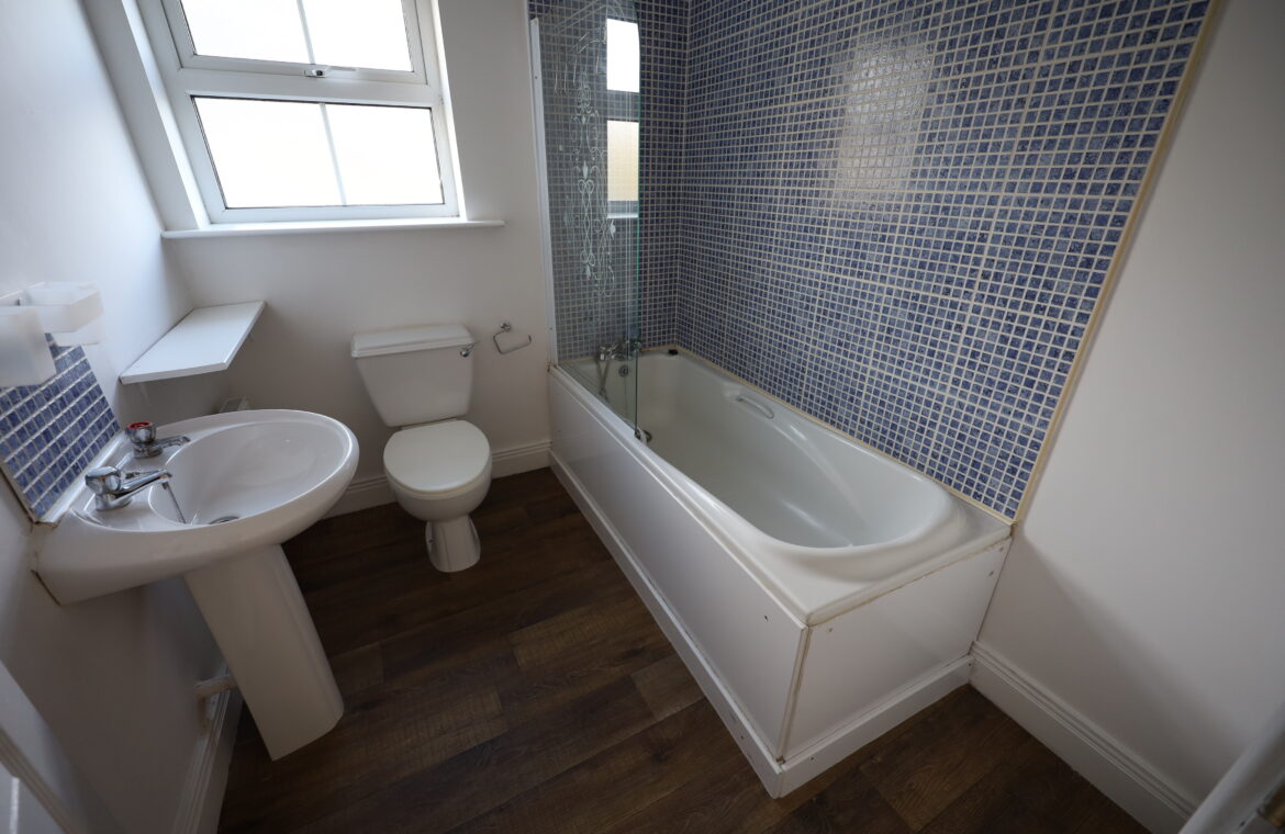 Spacious bathroom with white suite of toilet wash hand basin and pedestal. Vinyl flooring. Bath with glass shower door and mains telephone fitting. Tiled surround.