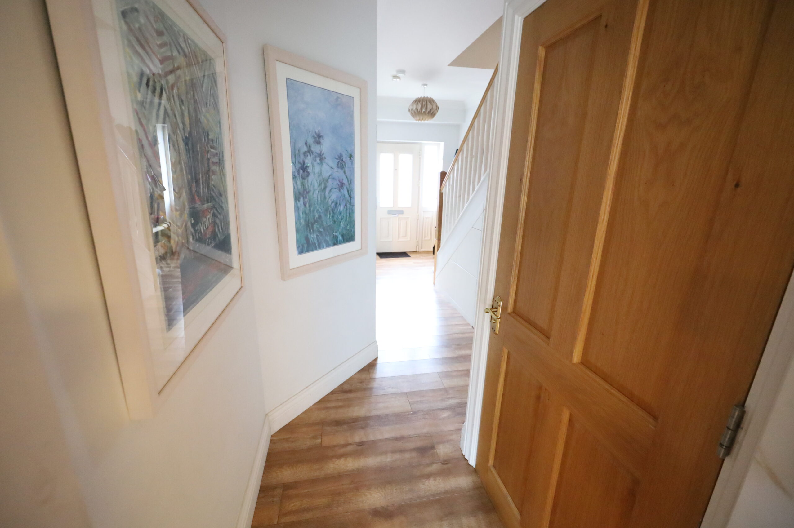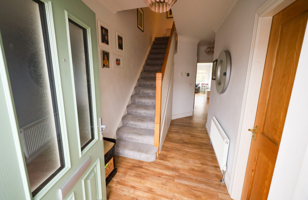 Over hanging canopy over front door. Beautiful composite front door with double glazed panels and double glazed side panel to reception hall. Reception hall with high quality laminate flooring. High ceilings with cornicing. Contemporary style newel post and solid oak banister with white painted spindles. Carpeted stairs to first floor. Cleverly designed under stair storage units.