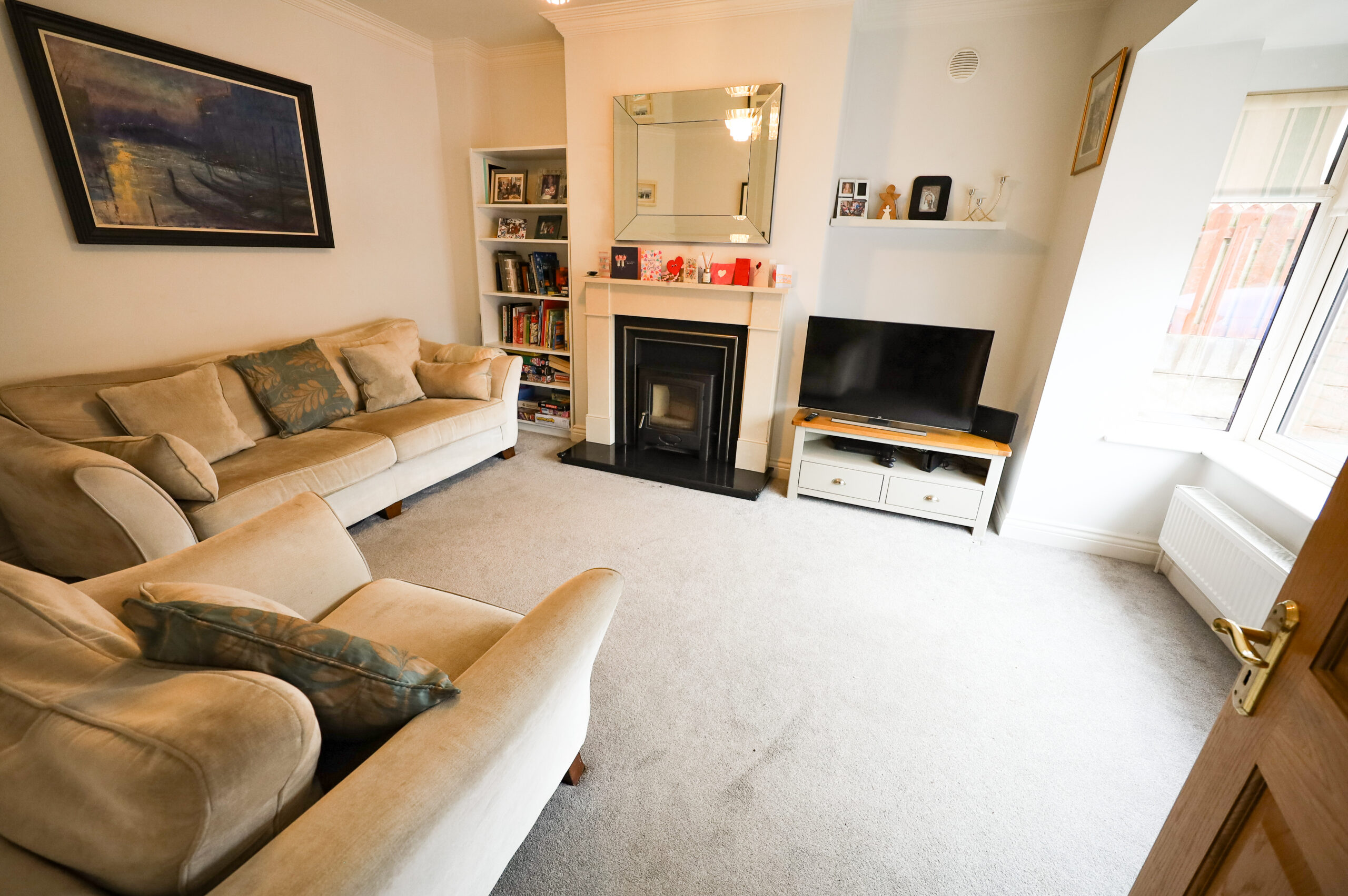 Bay window. Carpeted. High ceilings with cornicing. Open fireplace with contemporary granite surround and insert stove.
