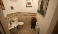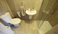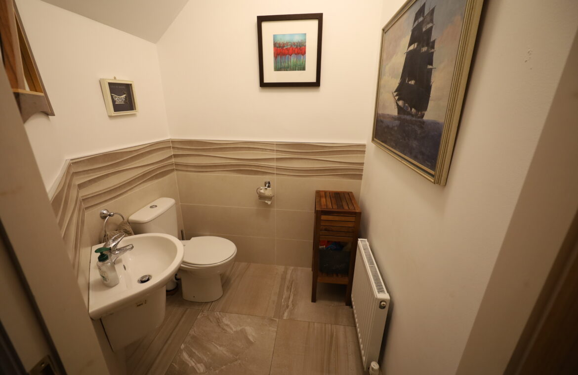 Wheelchair accessible with beautiful, tiled floor and dado height tiled walls. Dual flush toilet, wall mounted wash hand basin with mono block chrome mixer tap.