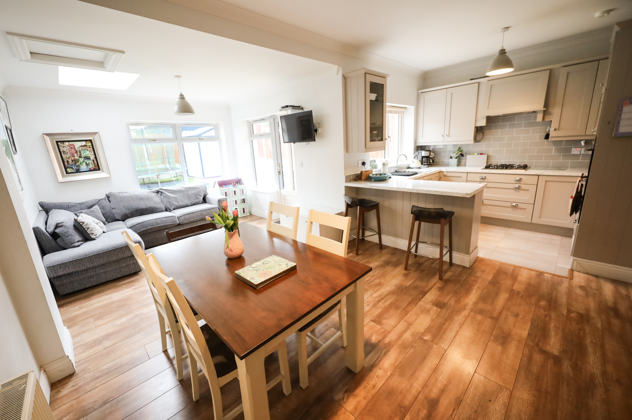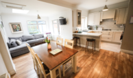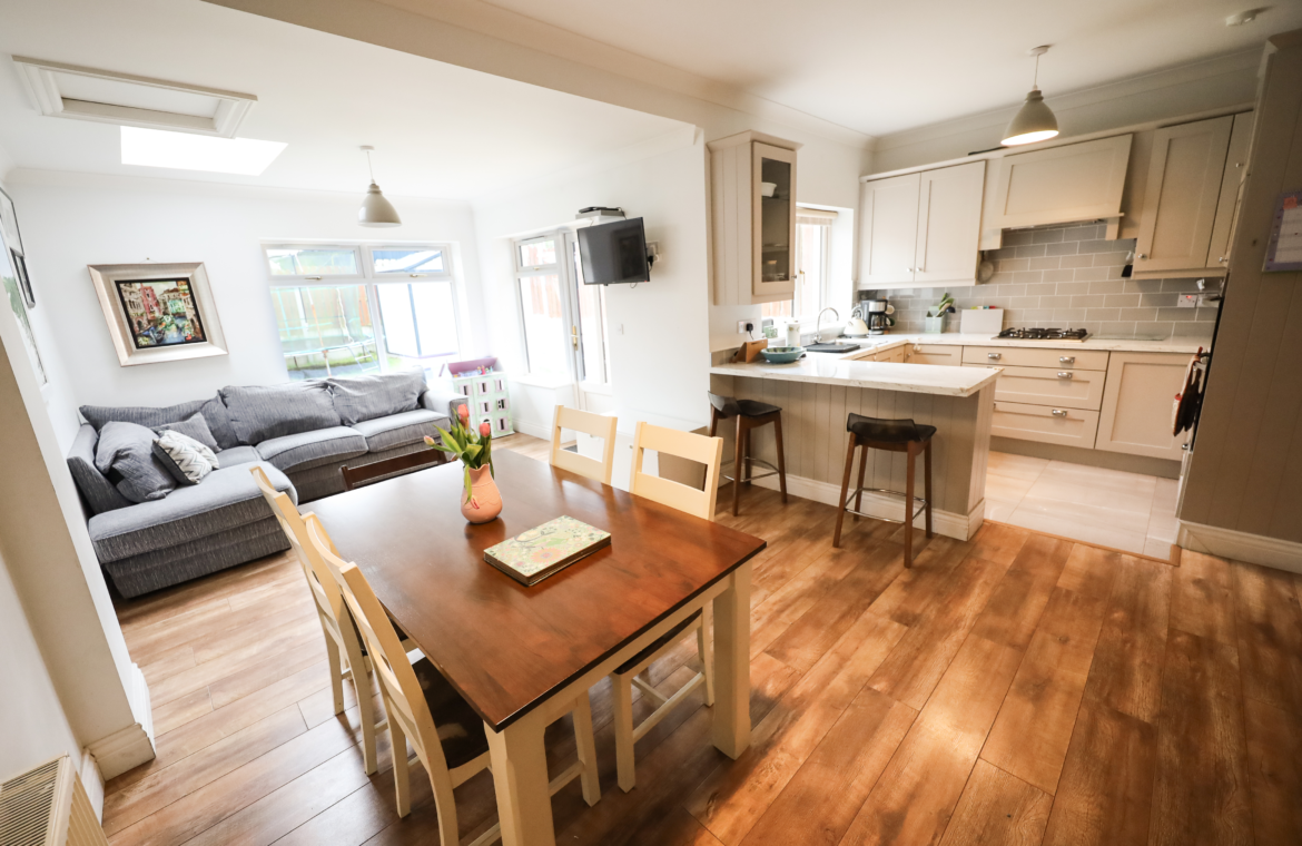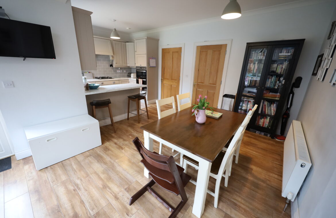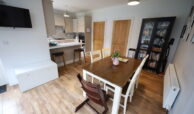 Dining/Living area with high quality laminate flooring. High ceiling in kitchen/dining area with coving.