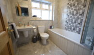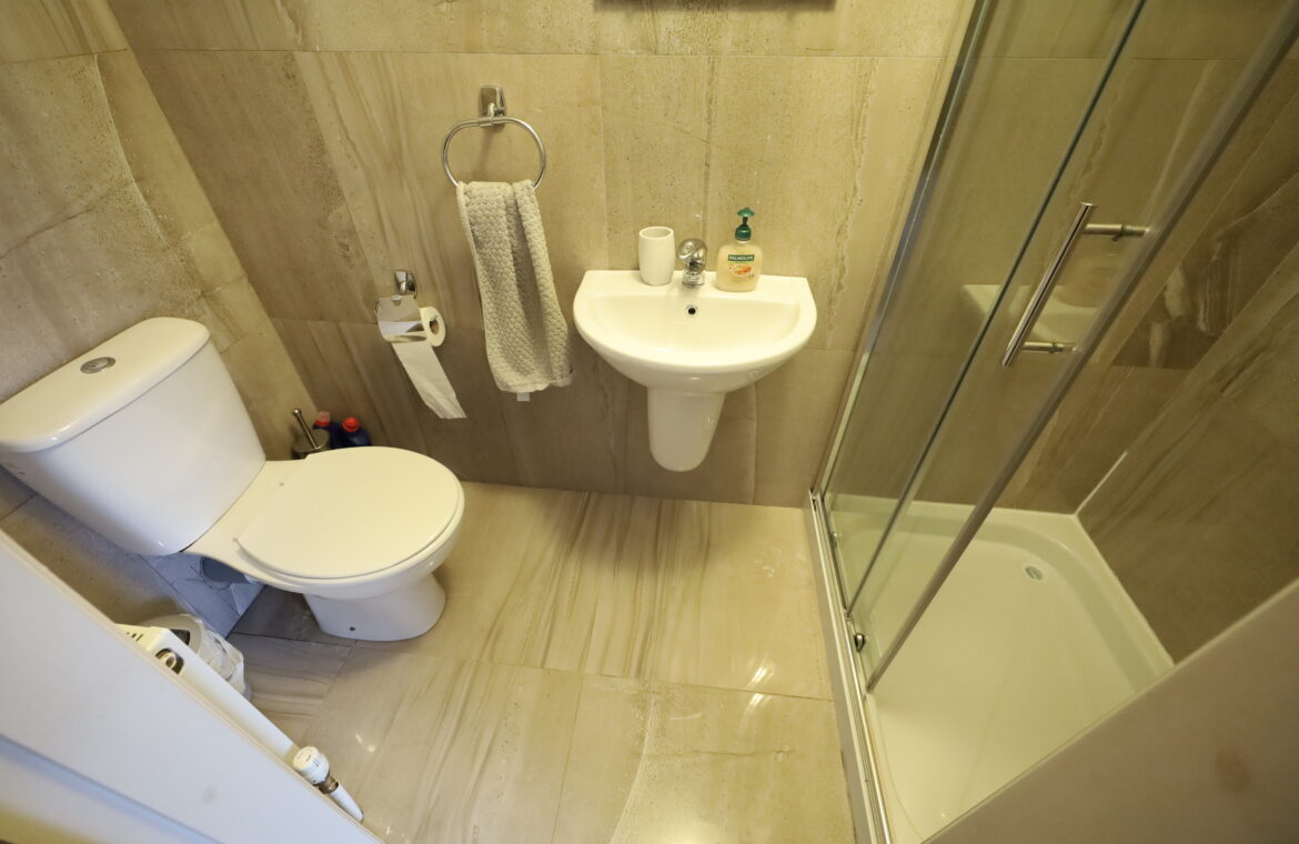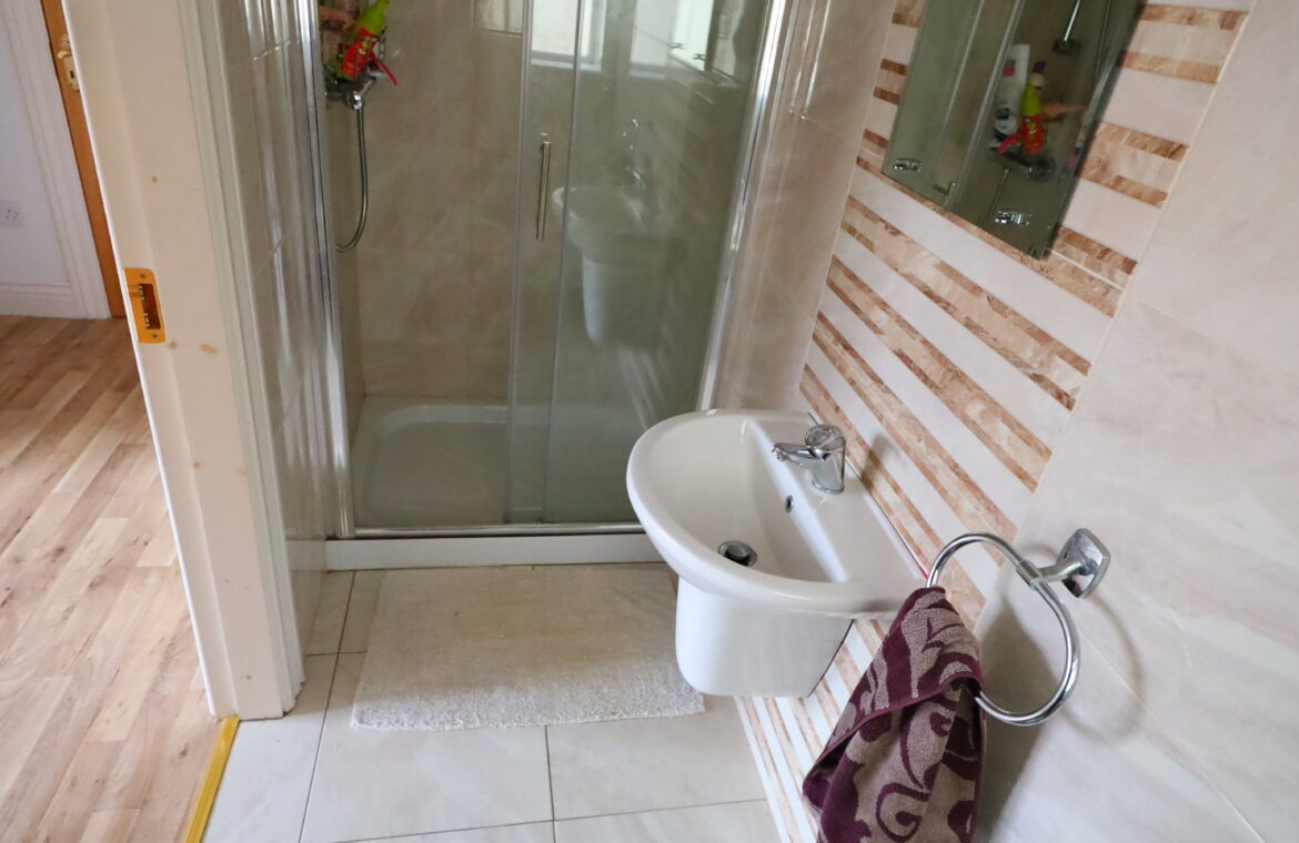 Spacious ensuite with window, tiled floor and beautifully tiled walls. Dual flush toilet, wall mounted wash hand basin with mono block chrome tap. Large shower enclosure with sliding glass door and mains (pumped) shower fitting.