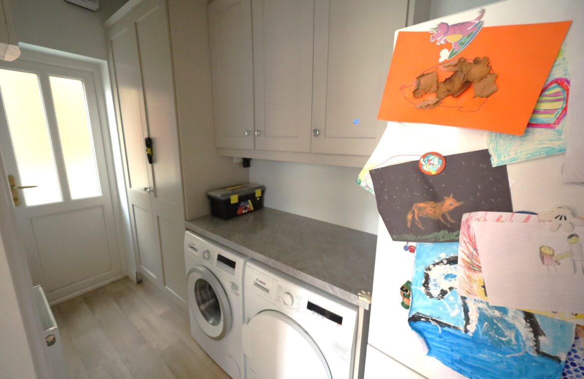 Spacious utility with quality laminate flooring. Contemporary units including broom closet housing modern gas boiler (zoned heating) and wall mounted units. Provision for washing machine and dryer. Door to side entrance.