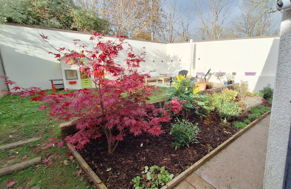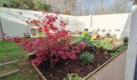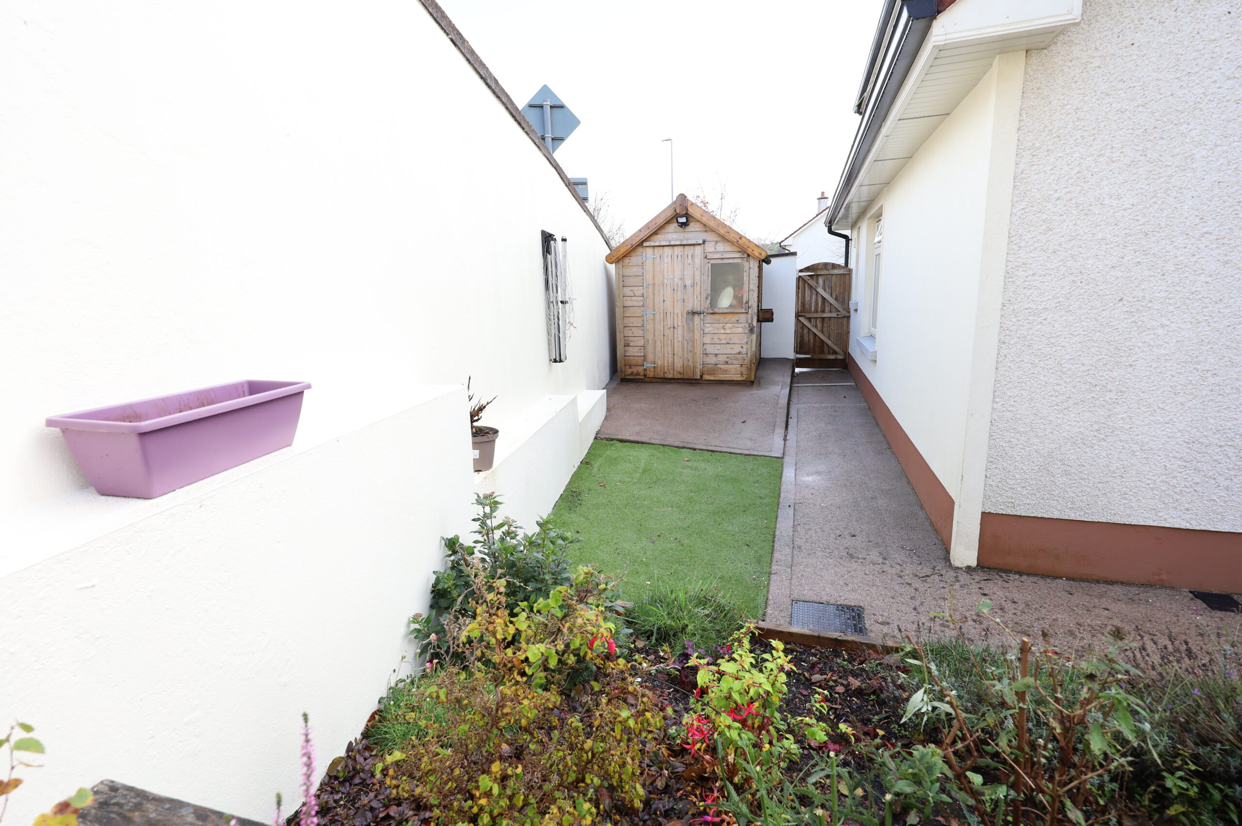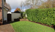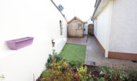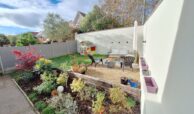 Large fully walled in rear garden, most privete and not overlooked. Flagstone patio, sleeper steps to slightly raises lawn with additional patio area. Grass lawn and array of beautiful shrubberies and specimen trees. Enclosed with attractive painted walls.Extra large side garden with astroturf and concrete area ideal for bin storage/utility area also offering potential to construct garage if required. Wooden garden shed.