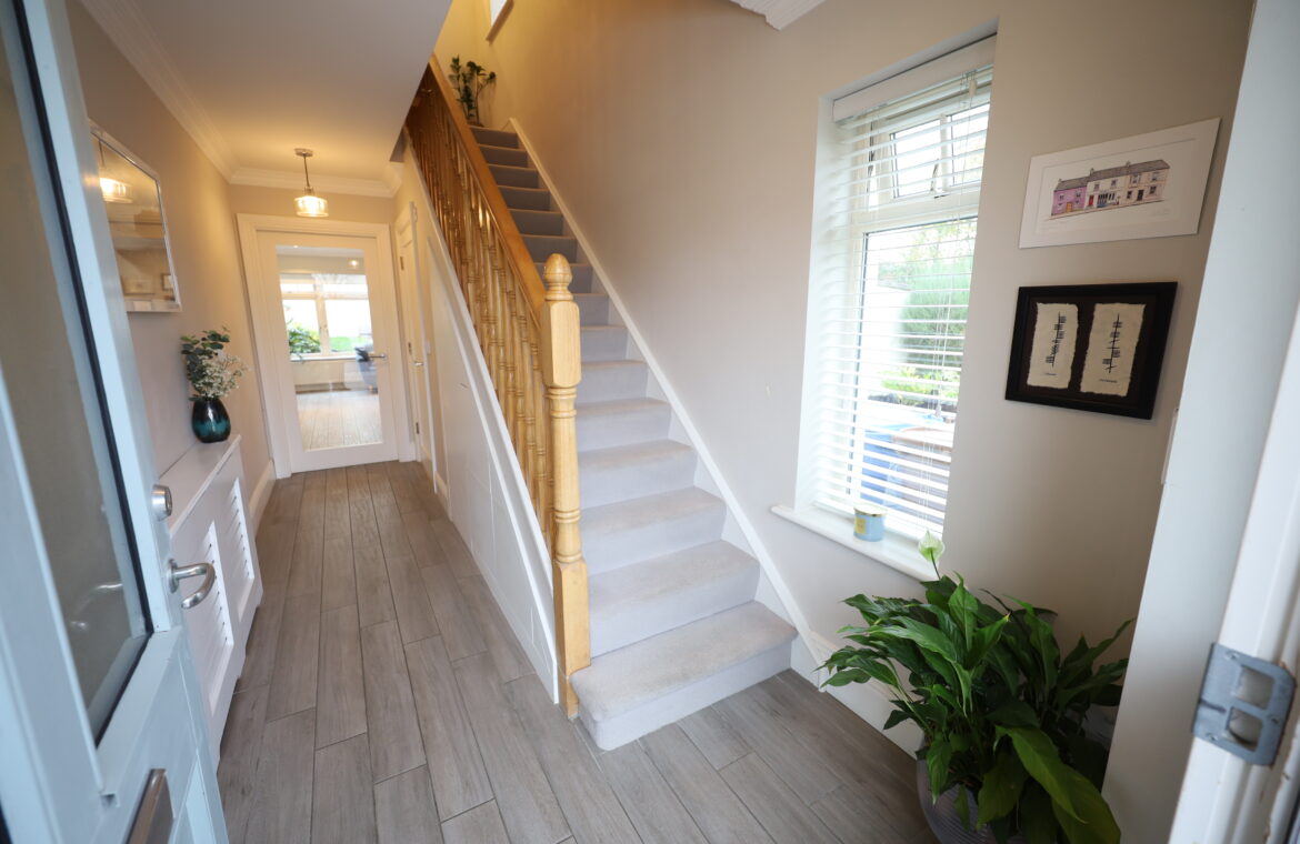 Composite front door with double glazed glass side panel to large reception hall. Reception hall with high ceilings, cornicing and ceramic tiled flooring. Attractive staircase with oak newel post, banister and turned spindles. Smart under stair storage. Radiator cover. Glass door to sitting room.