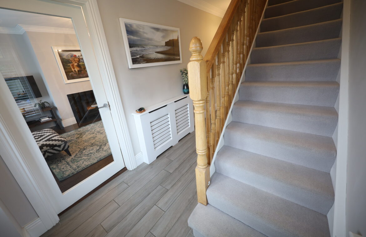 Beautifully carpeted stairs to first floor with spacious, carpeted landing. Solid oak doors to all rooms. Stira pull down ladder to attic storage. Large airing cupboard battened out for airing.