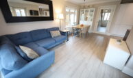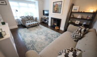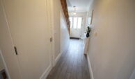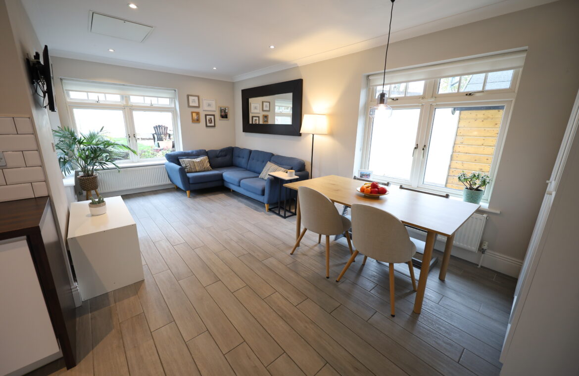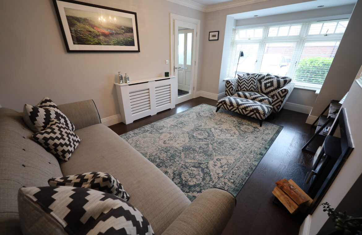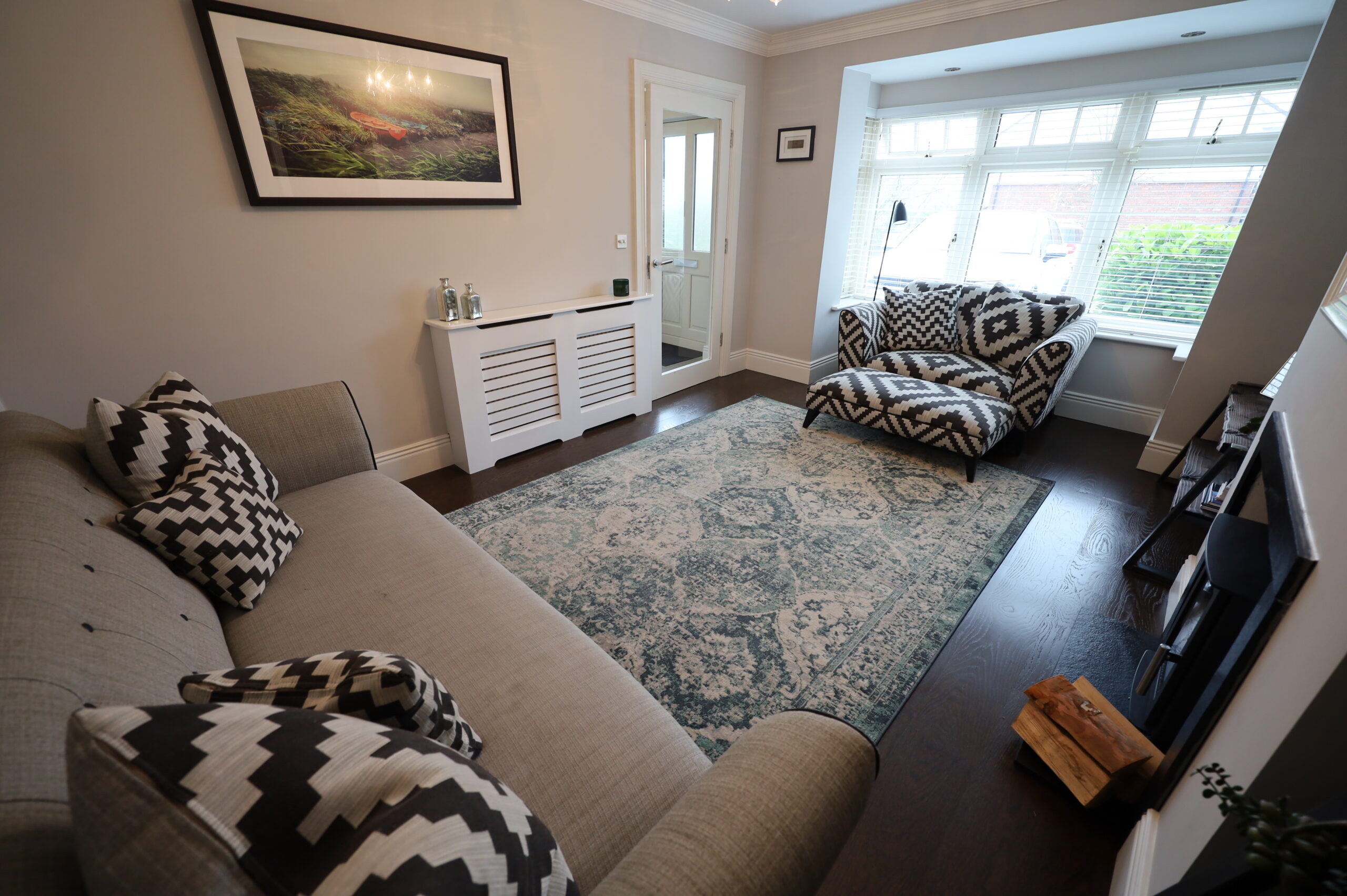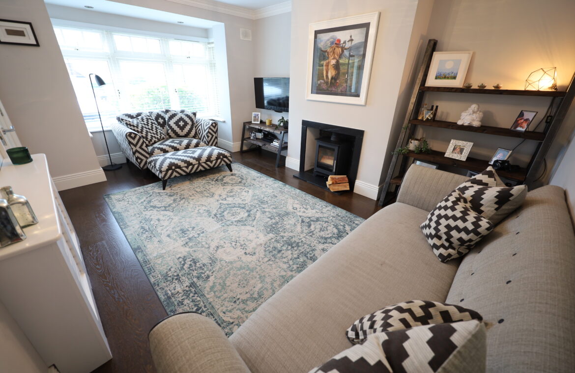 Solid engineered oak flooring. Bay window. Inglenook with stone cladding and contemporary freestanding stove. High ceilings, cornicing. Radiator cover.