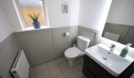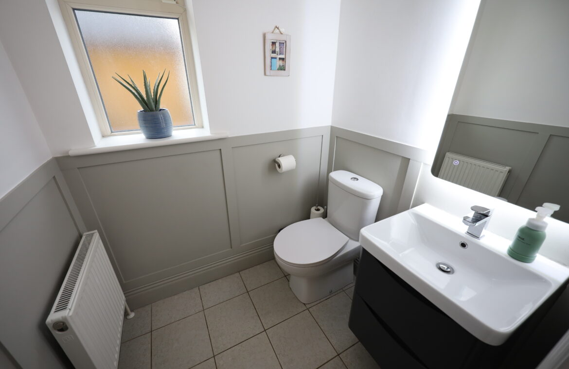 Large w.c. with ceramic tiled floor. Beautifully panelled walls. Contemporary suite of dual flush toilet, wash hand basin with mono block chrome tap and modern unit under.