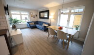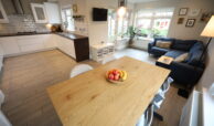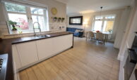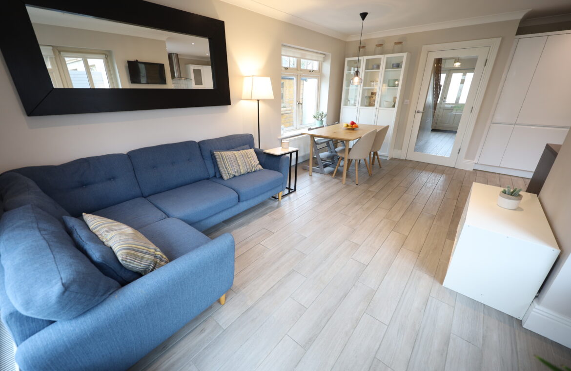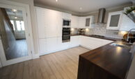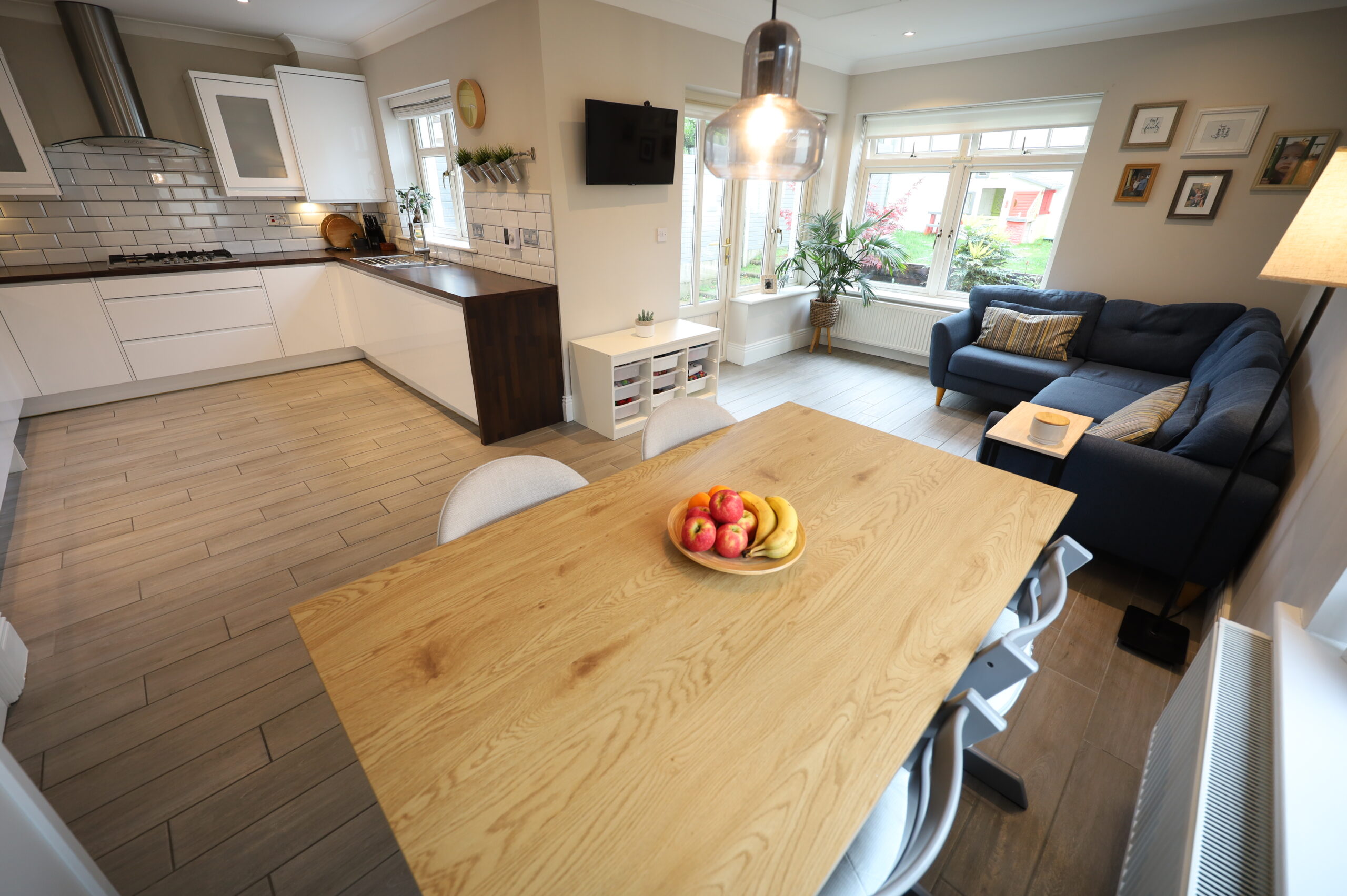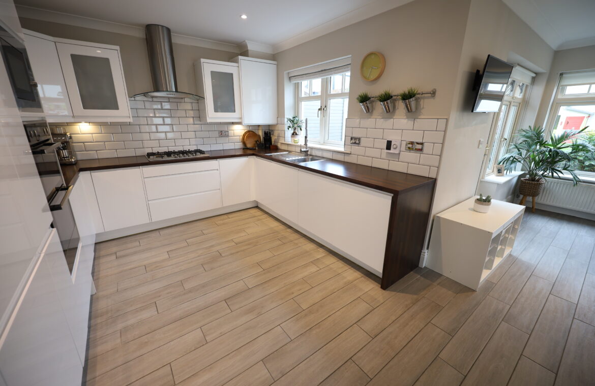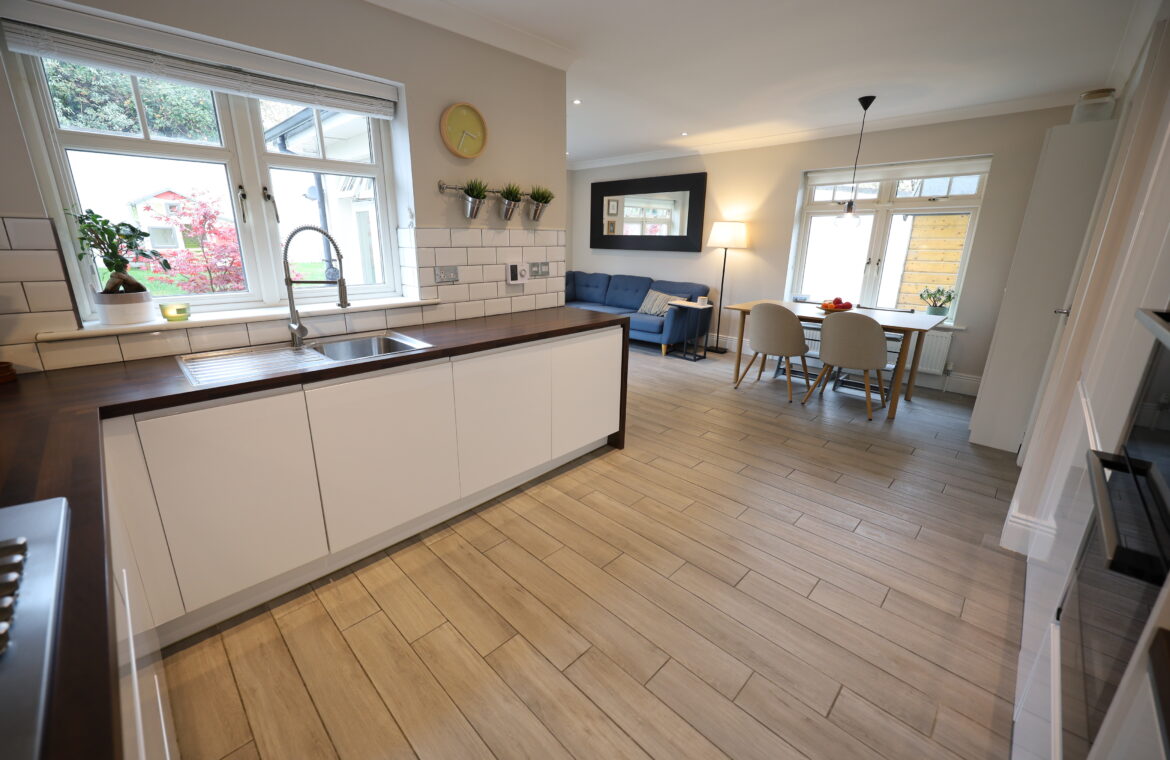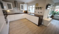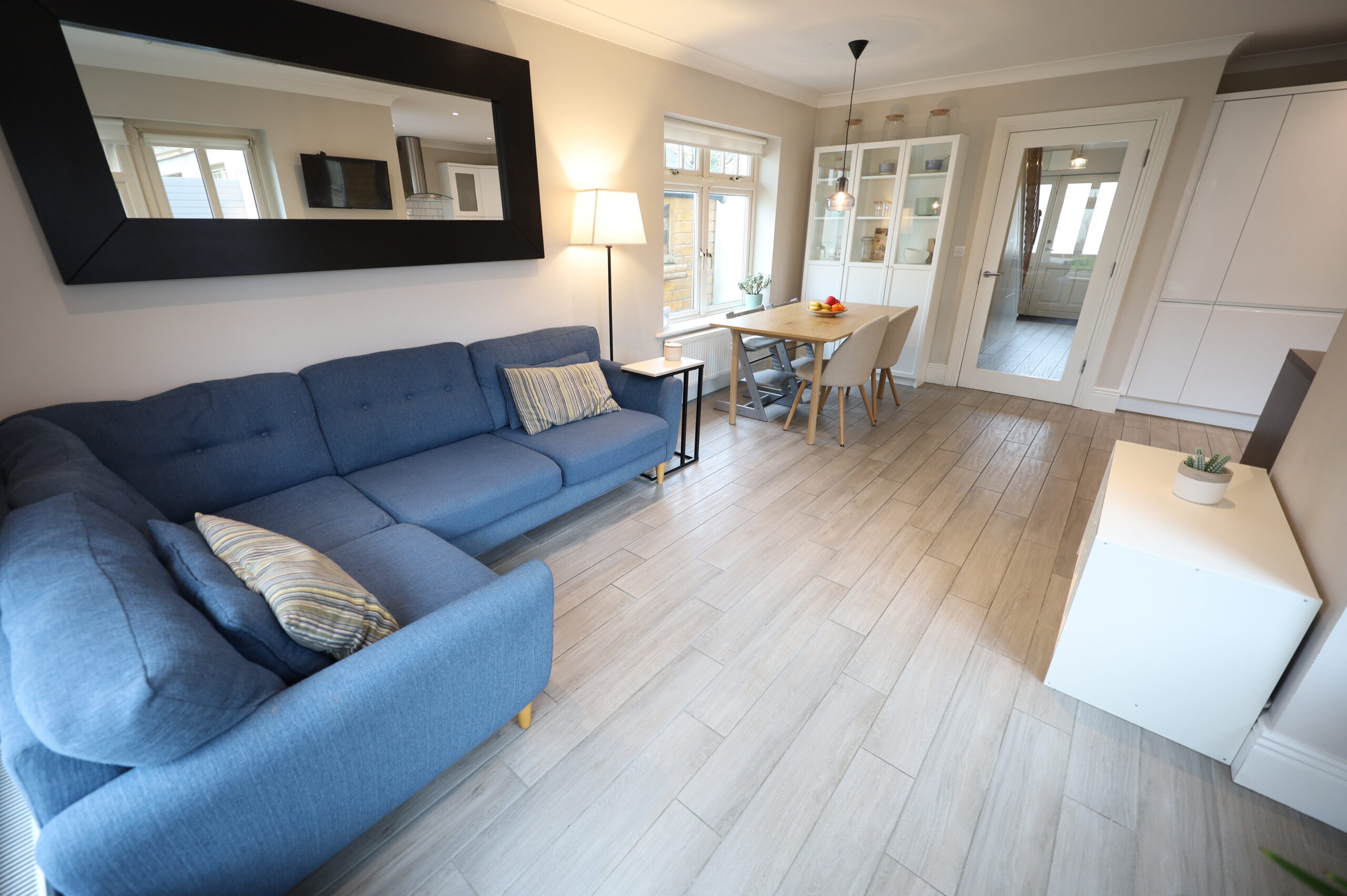 Glass door from reception hall. High quality white oak style ceramic tile throughout. Extensive contemporary fitted kitchen with large array of base and wall mounted units. Double eye level integrated oven. 5 ring gas hob, integrated fridge-freezer, dishwasher and washing machine. Subway tiling over countertop. Wall mounted units with concealed undermounted lighting, some glass fronted cabinets, stainless steel and glass stack style extractor hood. Living area with beautiful picture windows overlooking rear garden. Double glazed doors to rear patio.