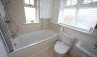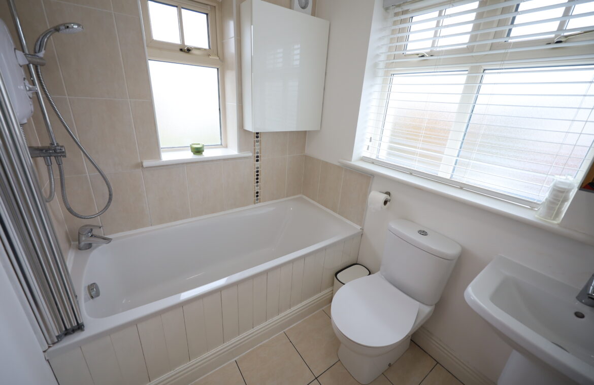 Ceramic tiled floor, beautifully tiled walls. White suite of dual flush toilet, wall mounted wash hand basin with mono block chrome tap. Bath with corner mounted mono block, chrome mixer tap, bi-folding shower door and electric shower unit over. Dual aspect windows.