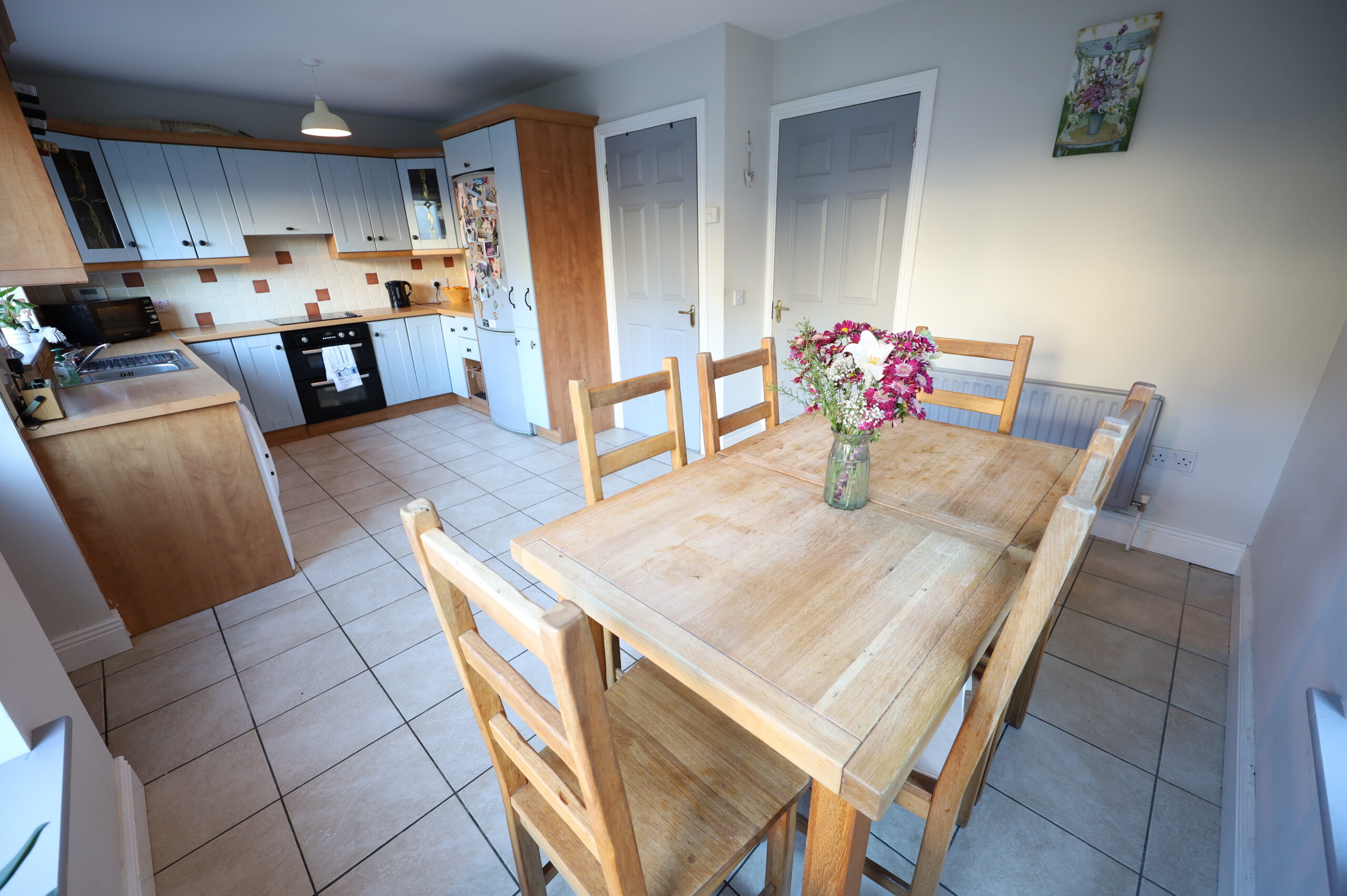 Ceramic tiled flooring throughout. Extensive array of built in fitted units. Single drainer stainless steel sink. Integrated double oven and hob included. Provision for dishwasher, washing machine and fridge-freezer. Pull out larder unit. Tiling over worktop. Excellent array of wall mounted units including display units, plate rack and wine. Integrated extractor hood with pull out canopy. Walk in Pantry/Closet off kitchen which can easily be converted to a utility room. Woodgrain PVC double glazed door to rear patio.