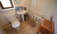 Spacious bathroom with tiled floor. White suite of dual flush toilet, wash hand basin and pedestal, hot & cold taps, tiling over. Bath with mains telephone shower fitting and glass shower screen.