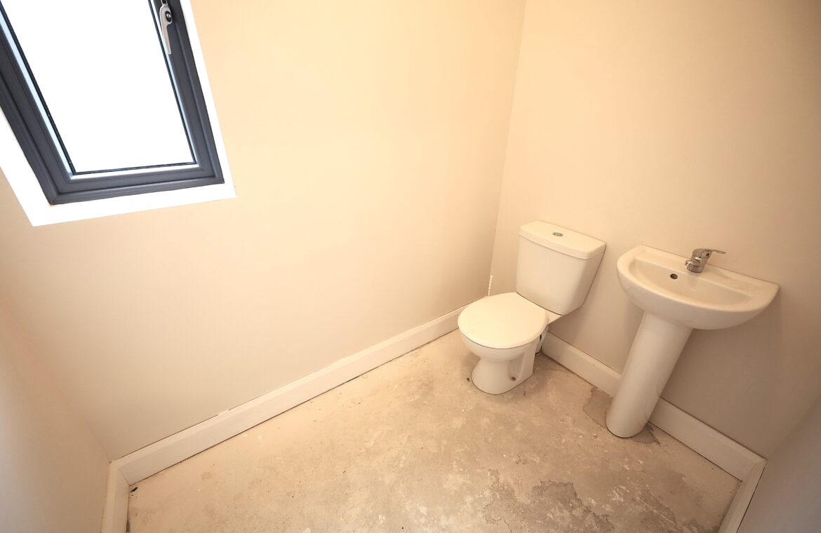 Spacious guest W.C. with white suite of dual flush toilet, wash hand basin with mono block chrome mixer tap and pedestal. Window.
