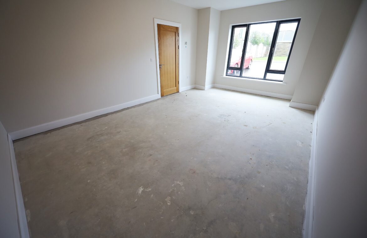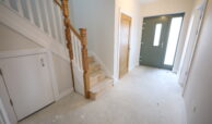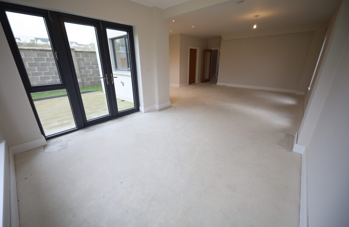 Large overhanging canopy over front porch. Composite front door with double glazed side panel. Large reception hall with high ceilings and contemporary oak doors to all rooms. Off set stairs to first floor with contemporary oak newel post, banister and white painted spindles. Closet under stairs.