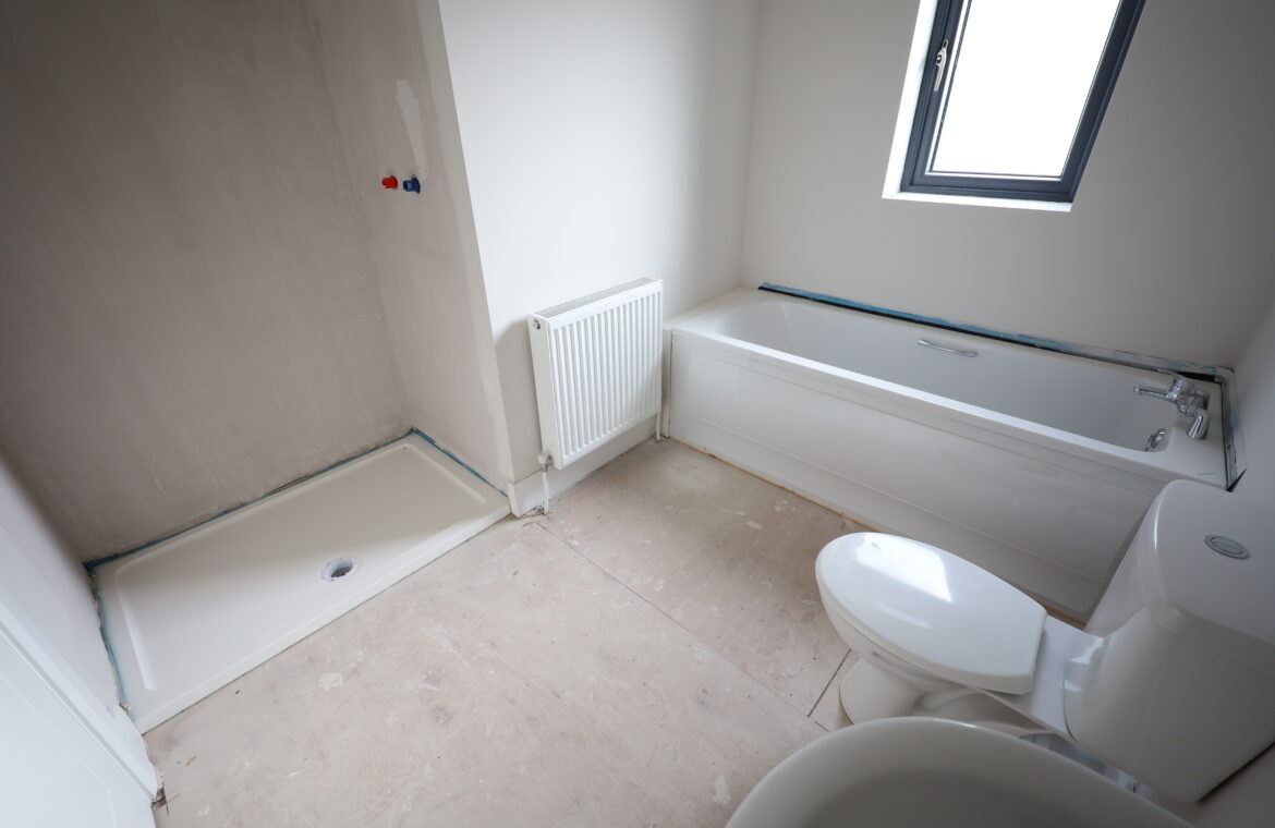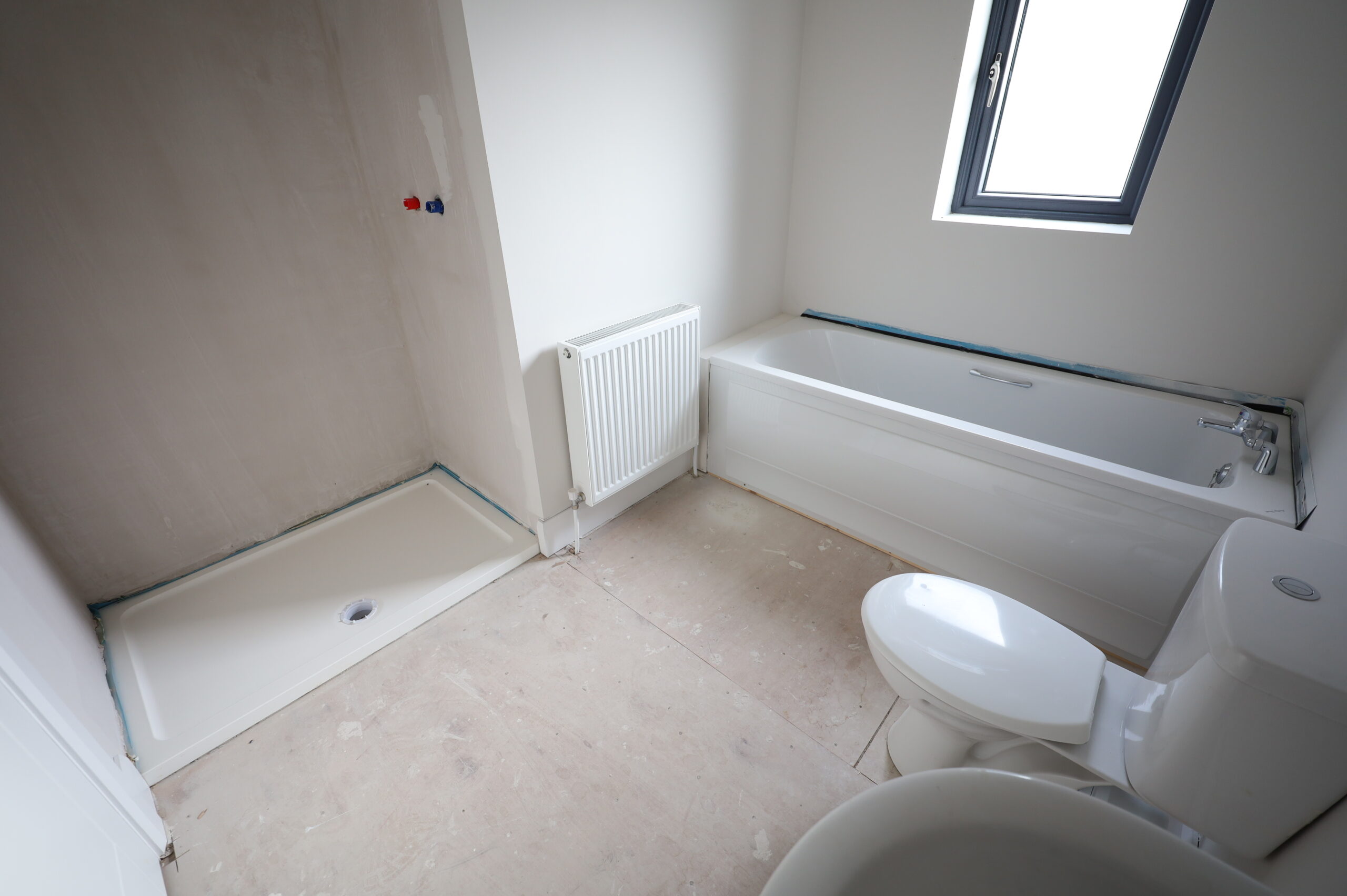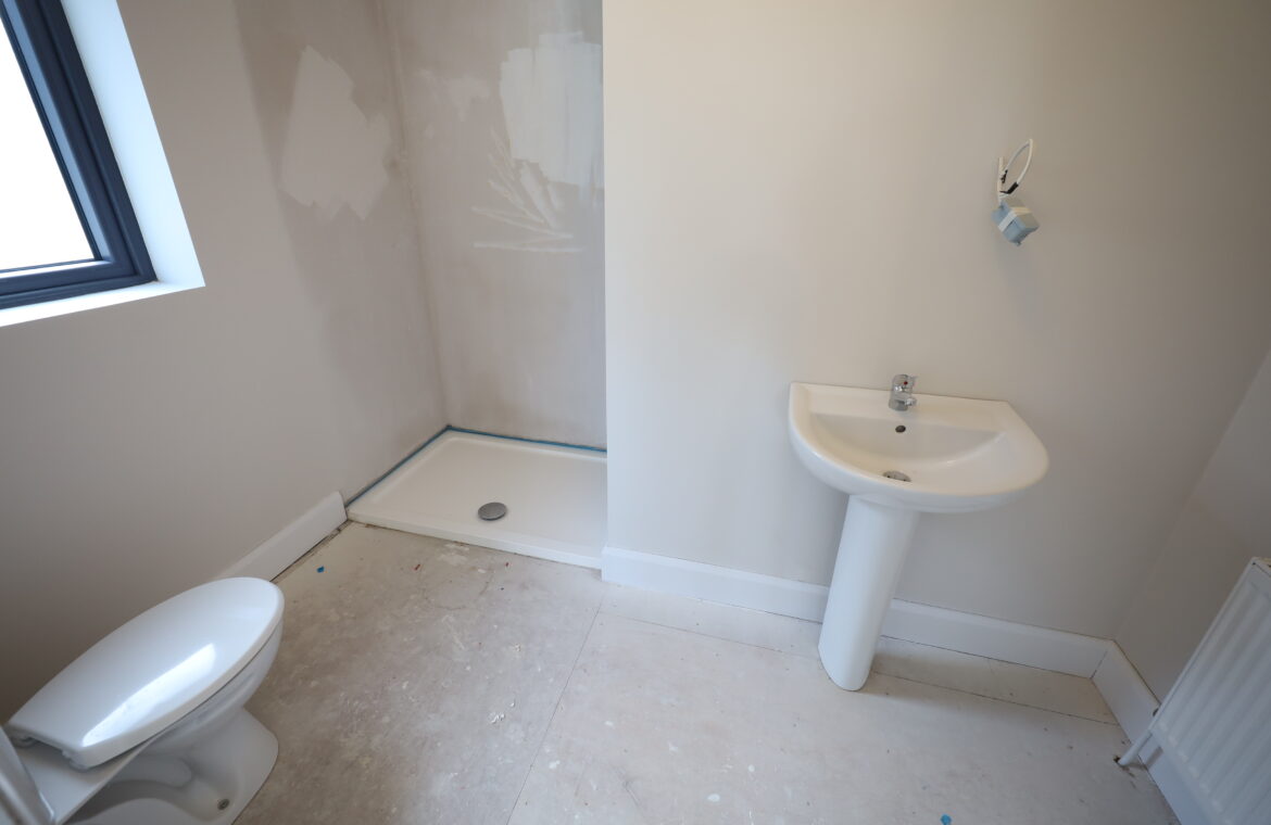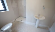 Large ensuite with white suite of dual flush toilet, wash hand basin and pedestal with mono block chrome mixer tap. Double size shower tray.