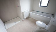 Spacious bathroom with white suite of dual flush toilet, wash hand basin and pedestal with mono block chrome mixer tap. Double sized shower tray.