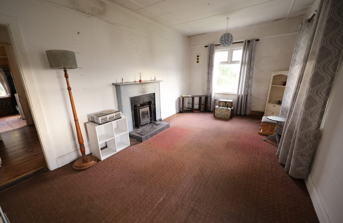 Sea glimpses of Ringabella Bay. Carpeted. Open fireplace with stove insert, tiled hearth and surround. Doors to kitchen/dining room and two bedrooms.