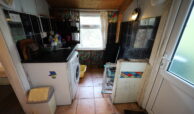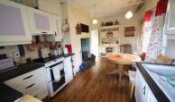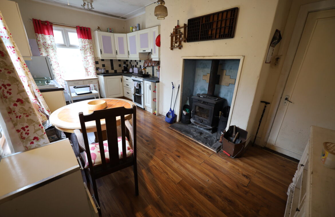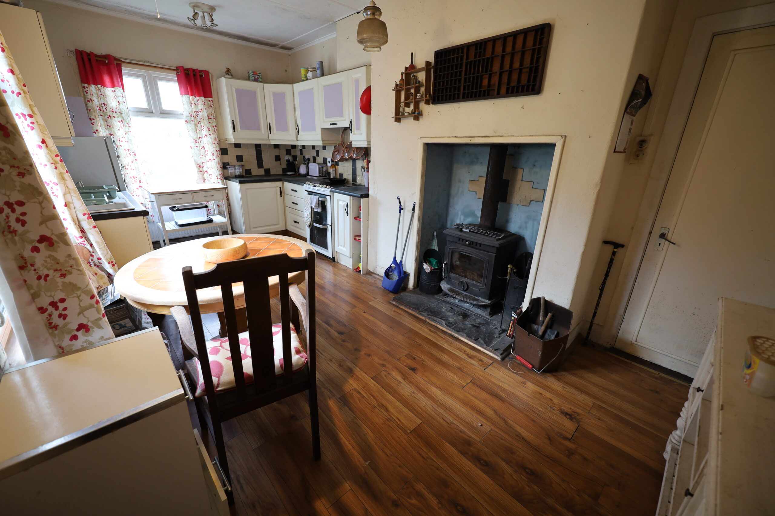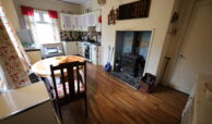 Laminate Flooring. Large cast iron stove in inglenook. Cream fitted kitchen with tiling over worktop, composite bowl and a half sink. Utility off.