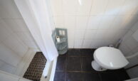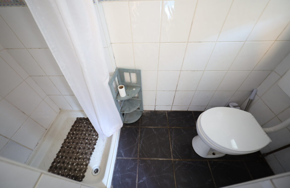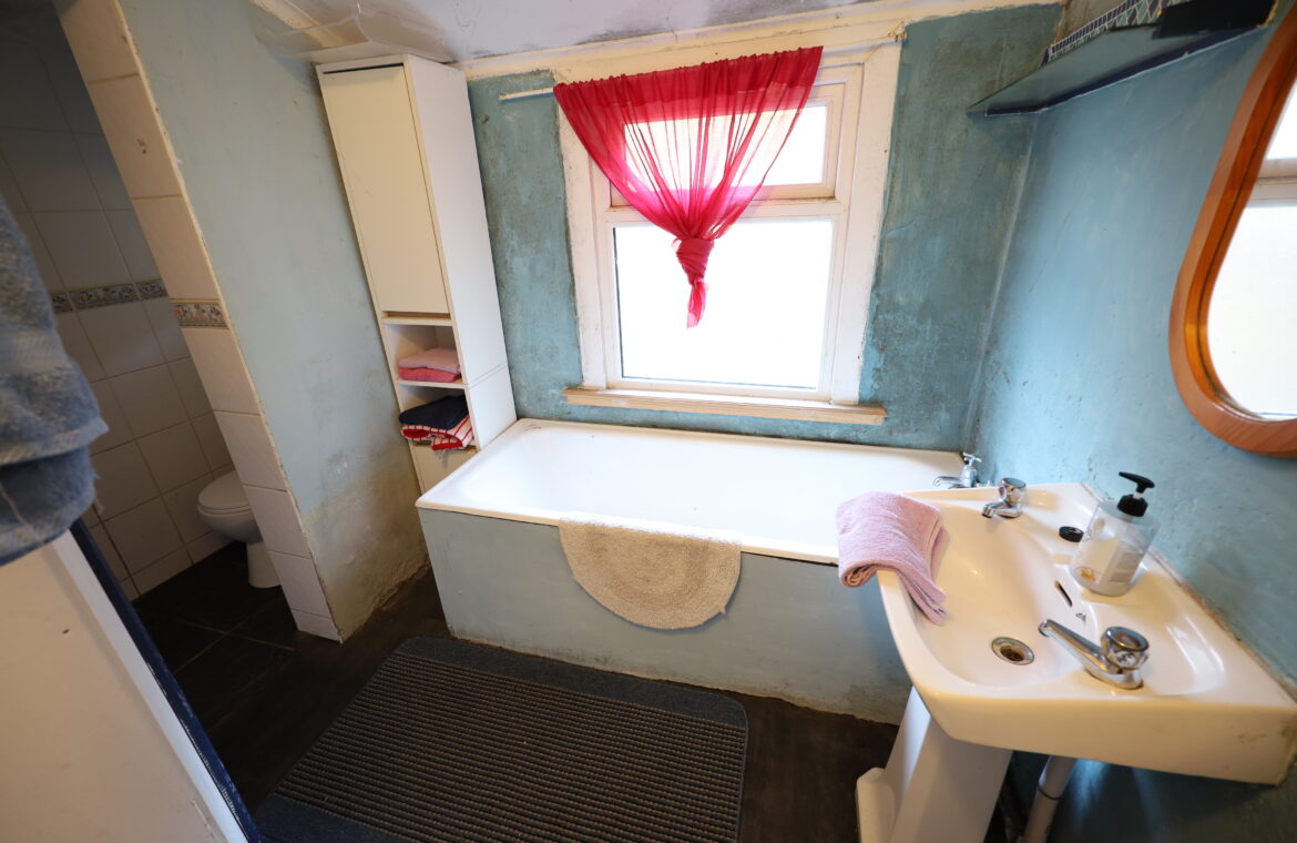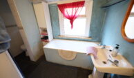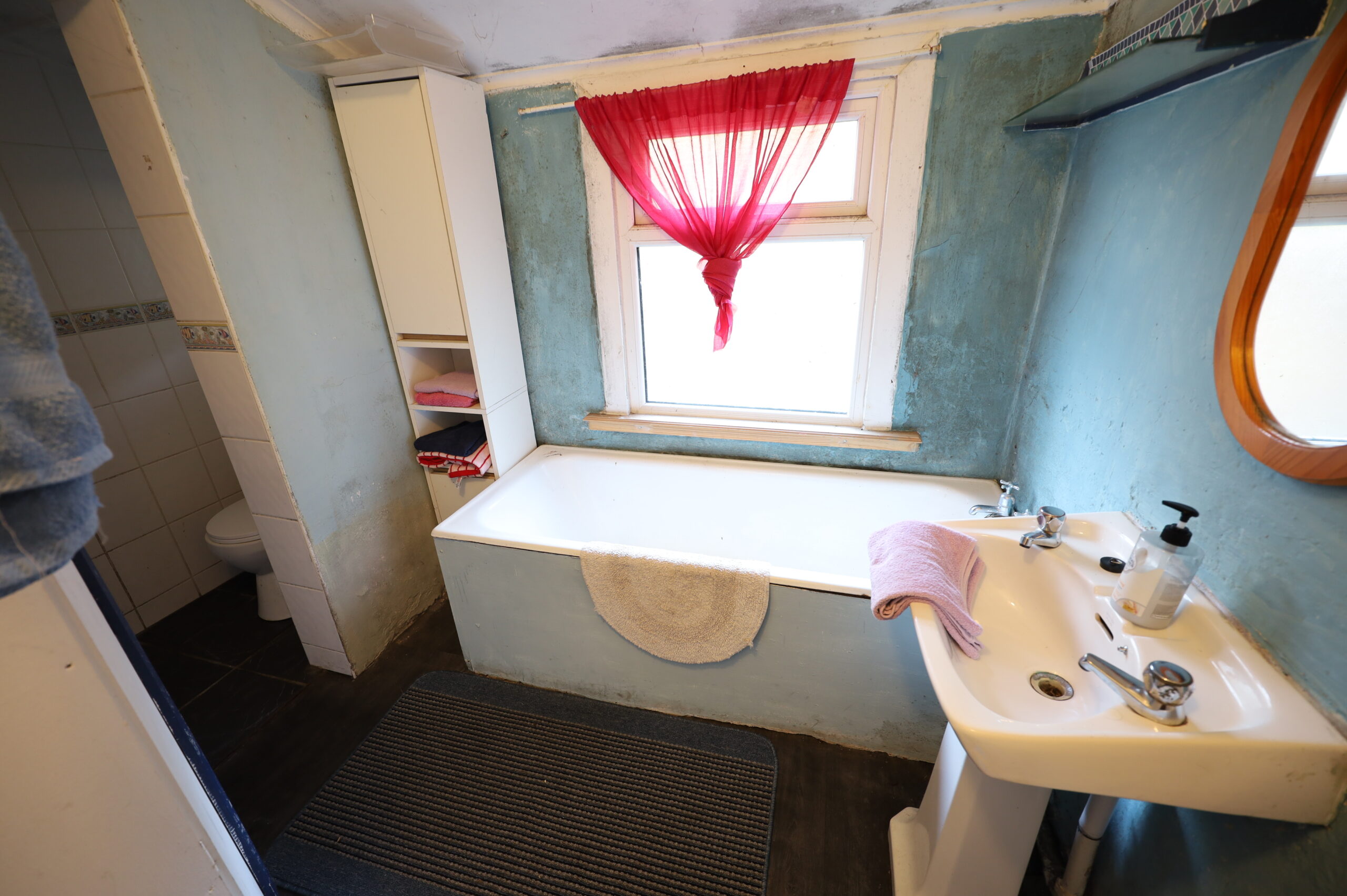 Bathroom with vinyl flooring. Toilet, bath, wash hand basin and pedestal. Separate shower enclosure with tiled walls and electric shower unit.