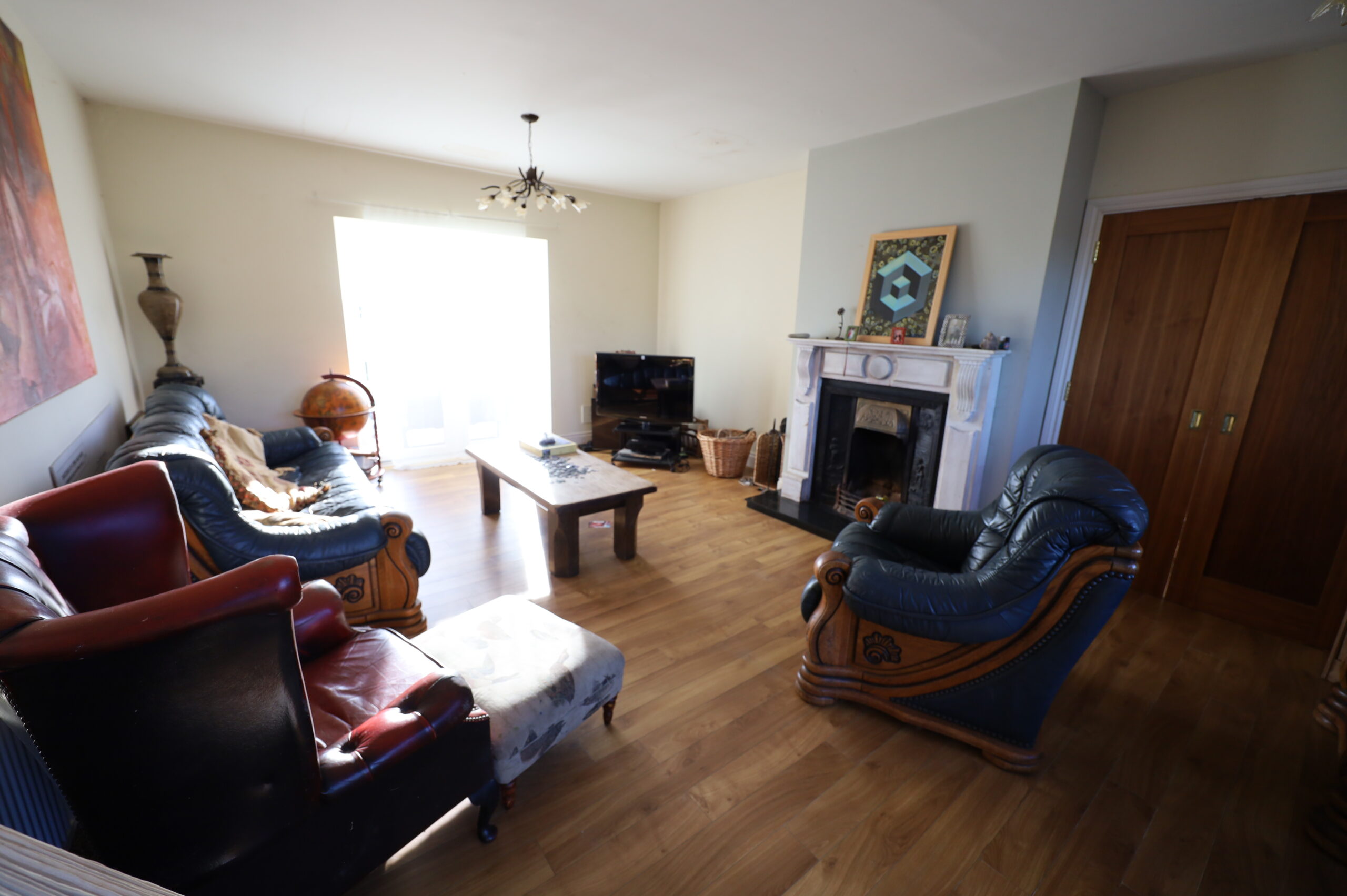 Laminate flooring. Attractive open fireplace with ornate cast iron and timber surround. Double Cherrywood doors to den/study.