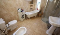 Floor and walls tiled throughout. Free standing roll top bath. Quadrant, double sized shower enclosure with glass shower doors. Toilet, bidet, wash hand basin and pedestal.