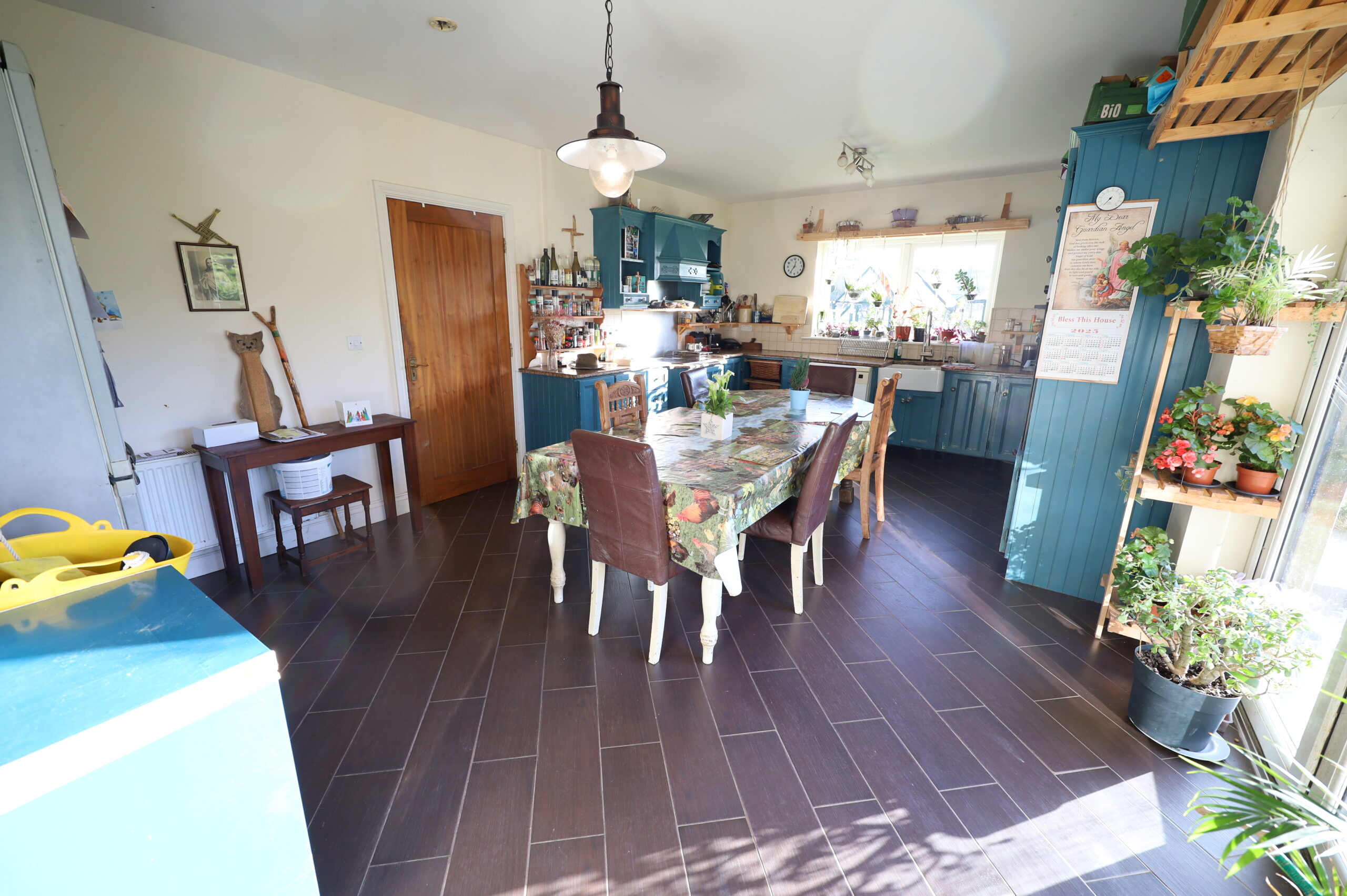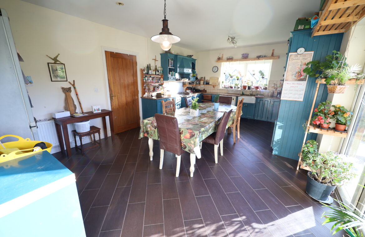 Ceramic tiled flooring throughout. Extensive fitted kitchen with large array of base and wall mounted units. Integrated double oven. Granite worktops. Under counter mounted Belfast sink. Ceramic hob. Wall mounted units with integrated extractor hood and open display units. Utility off.