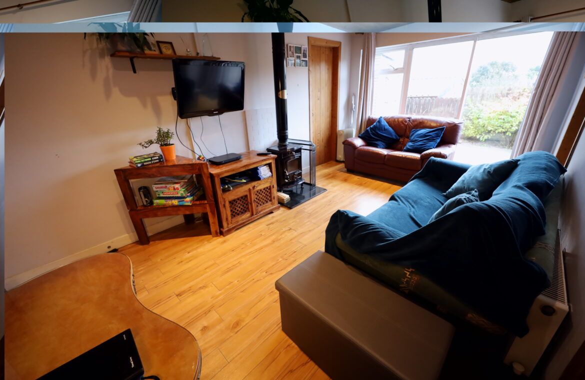 Quality laminate flooring. Beautiful enamelled, free standing cast iron stove on granite slab. Aluminium sliding door to front driveway/patio which offers a sea glimpse. Pine sheeted ceiling.
