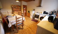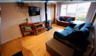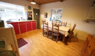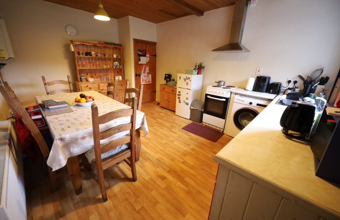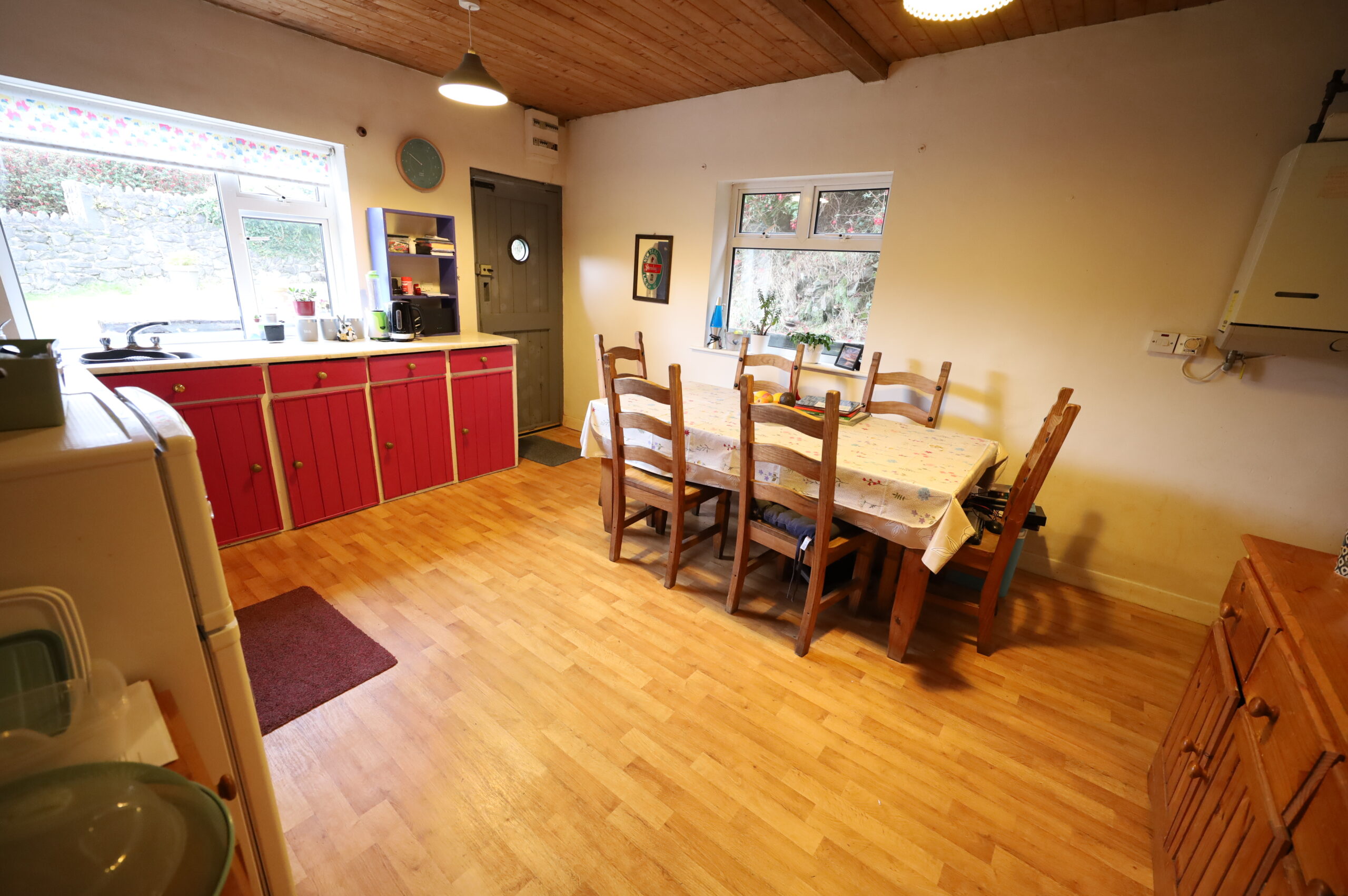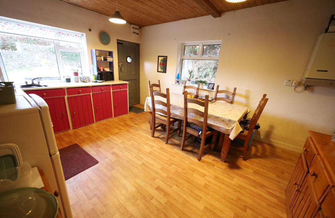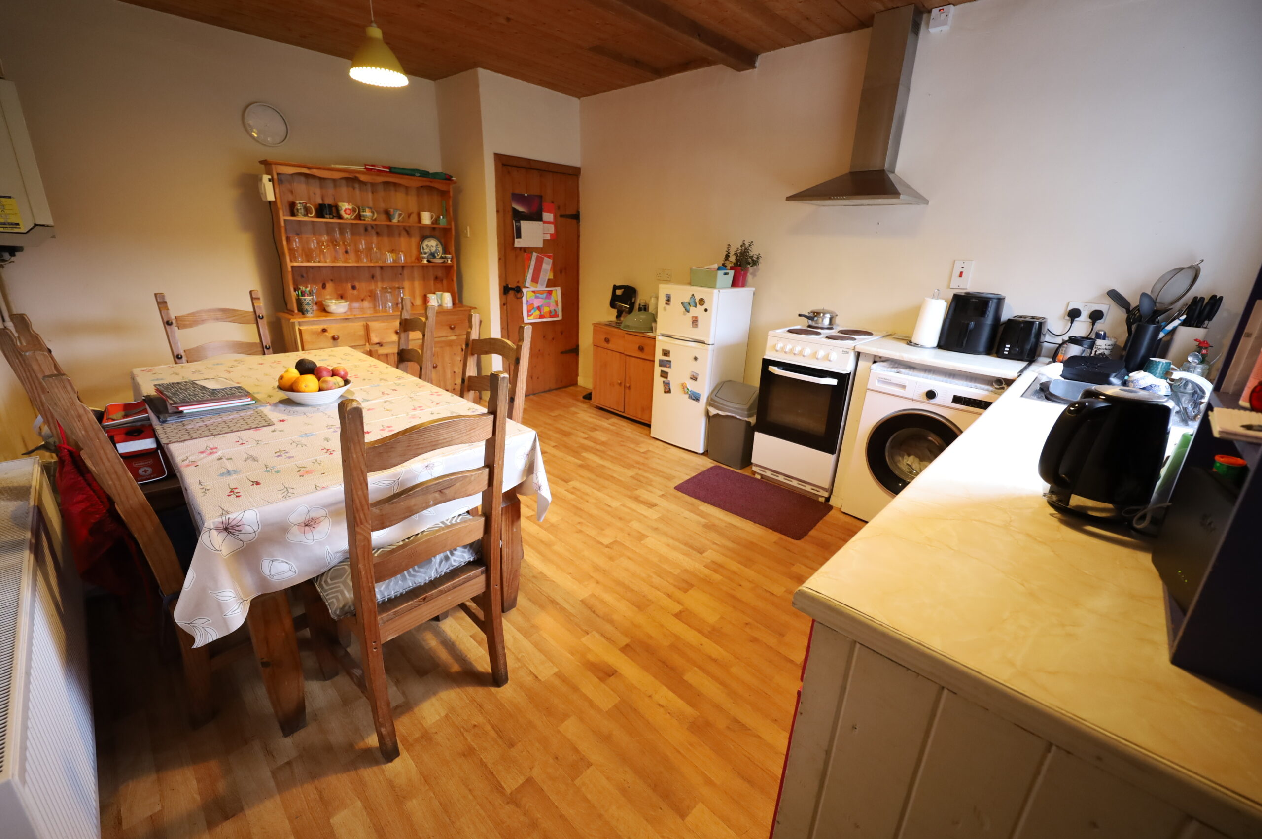 Quality vinyl flooring. Built in fitted kitchen, single drainer stainless steel sink, cooker, fridge-freezer included, stainless steel canopy style extractor hood. Pine sheeted ceiling. Teak sheeted door to side garden.  (Pine dresser, kitchen table and chairs available at a purchasers discretion)