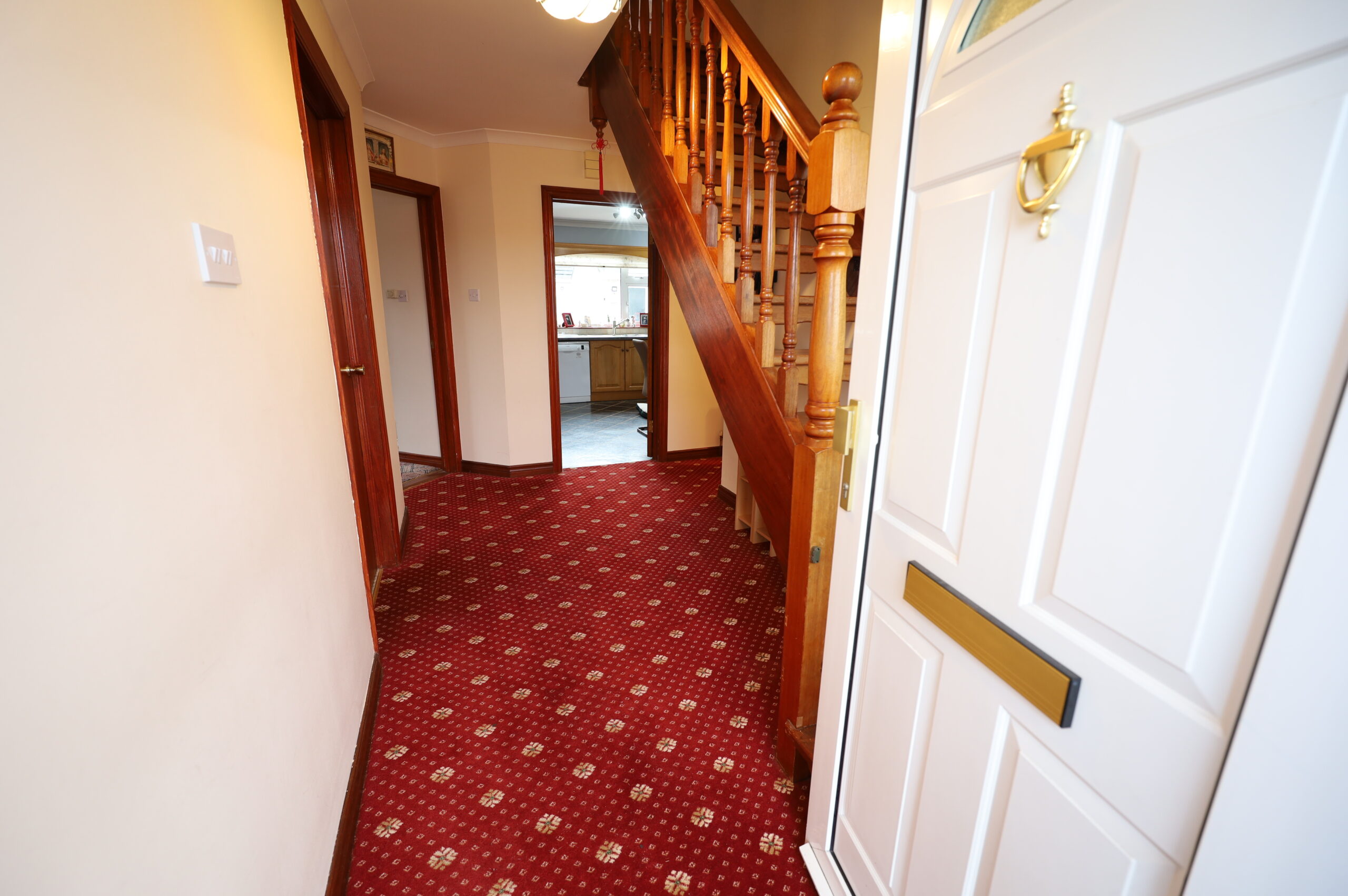 Composite PVC front door with glass side panel to spacious reception hall. Corridor off.