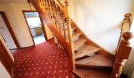 Reception hall carpeted with solid teak staircase, newel post, banister and turned spindles to first floor.