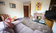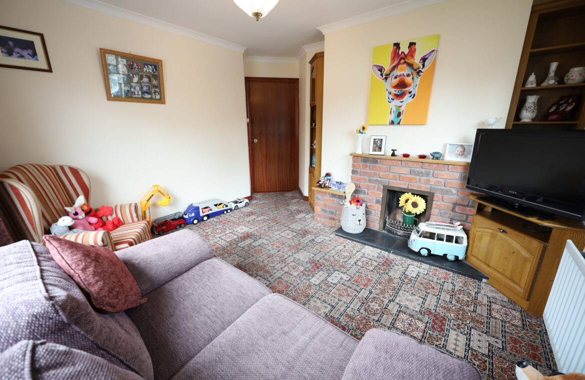 Carpeted. Open fireplace with brick surround and slate hearth. Coving. Fitted display unit.
