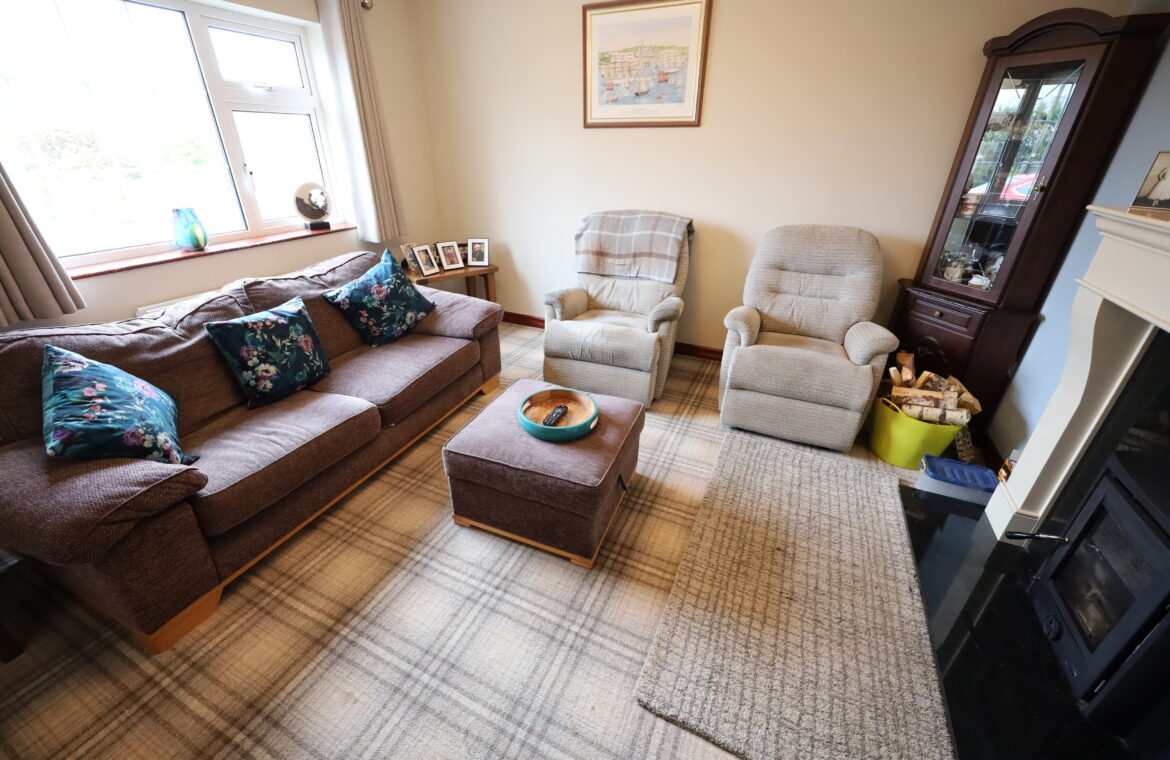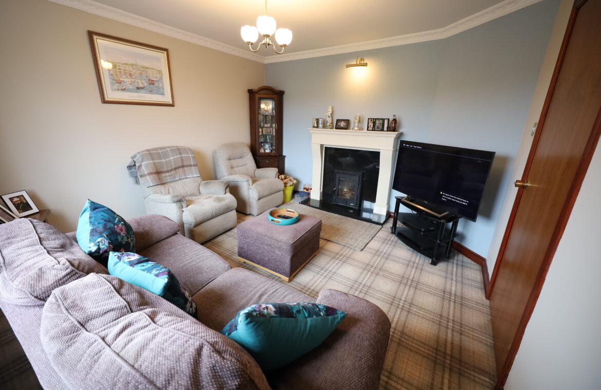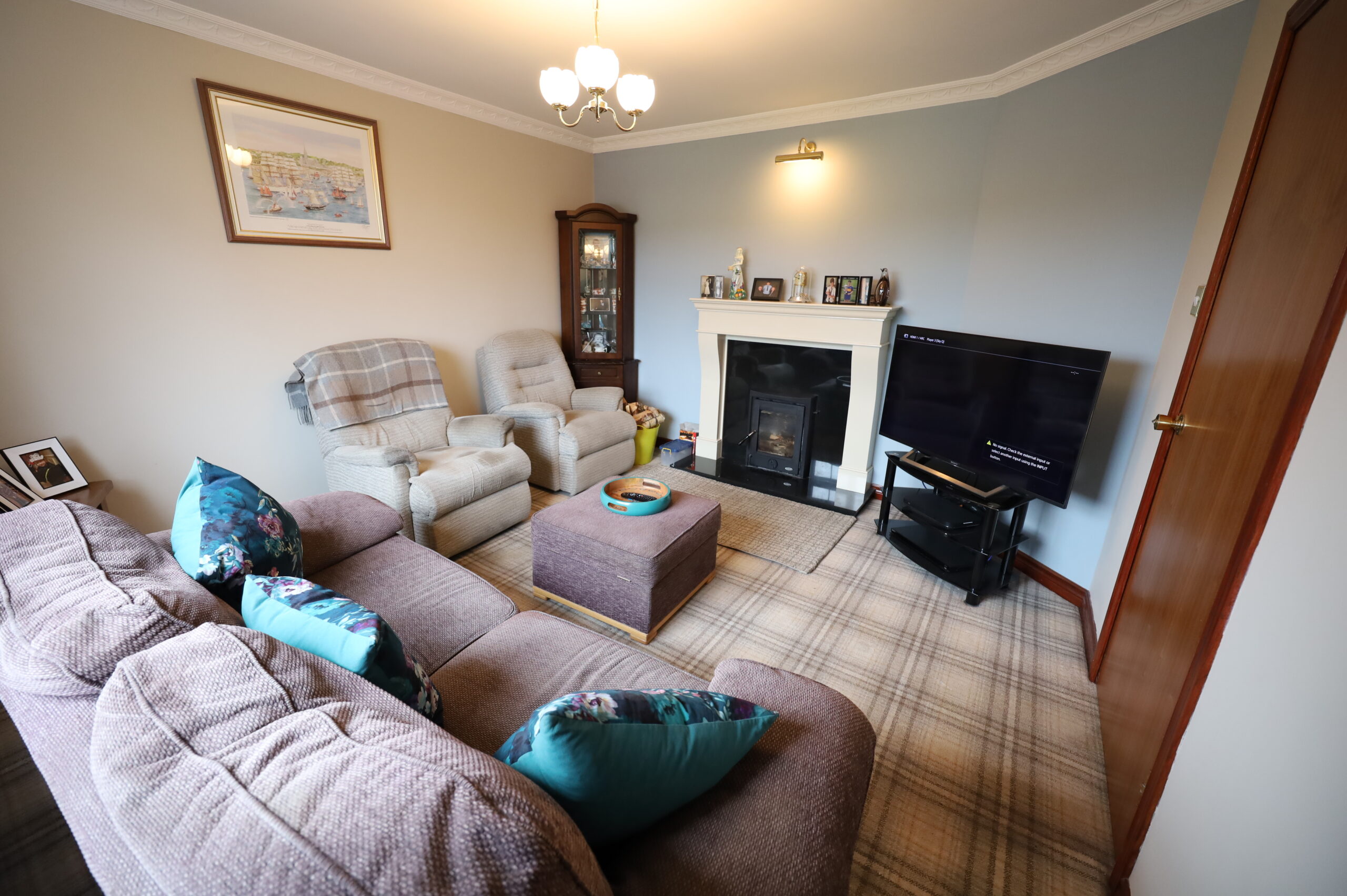 Carpeted. Fireplace with granite surround and stove insert. Centre rose.