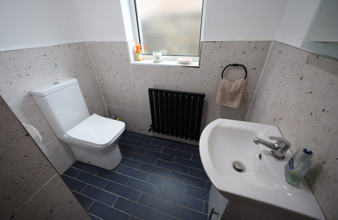 Recently remodelled ensuite, beautifully tiled floor and walls throughout with white suite of dual flush toilet, wash hand basin with mono block chrome mixer tap and vanity under. Recessed shower enclosure with bi folding glass shower doors and electric shower unit. Rack style chrome radiator.