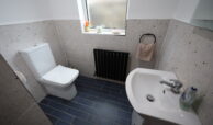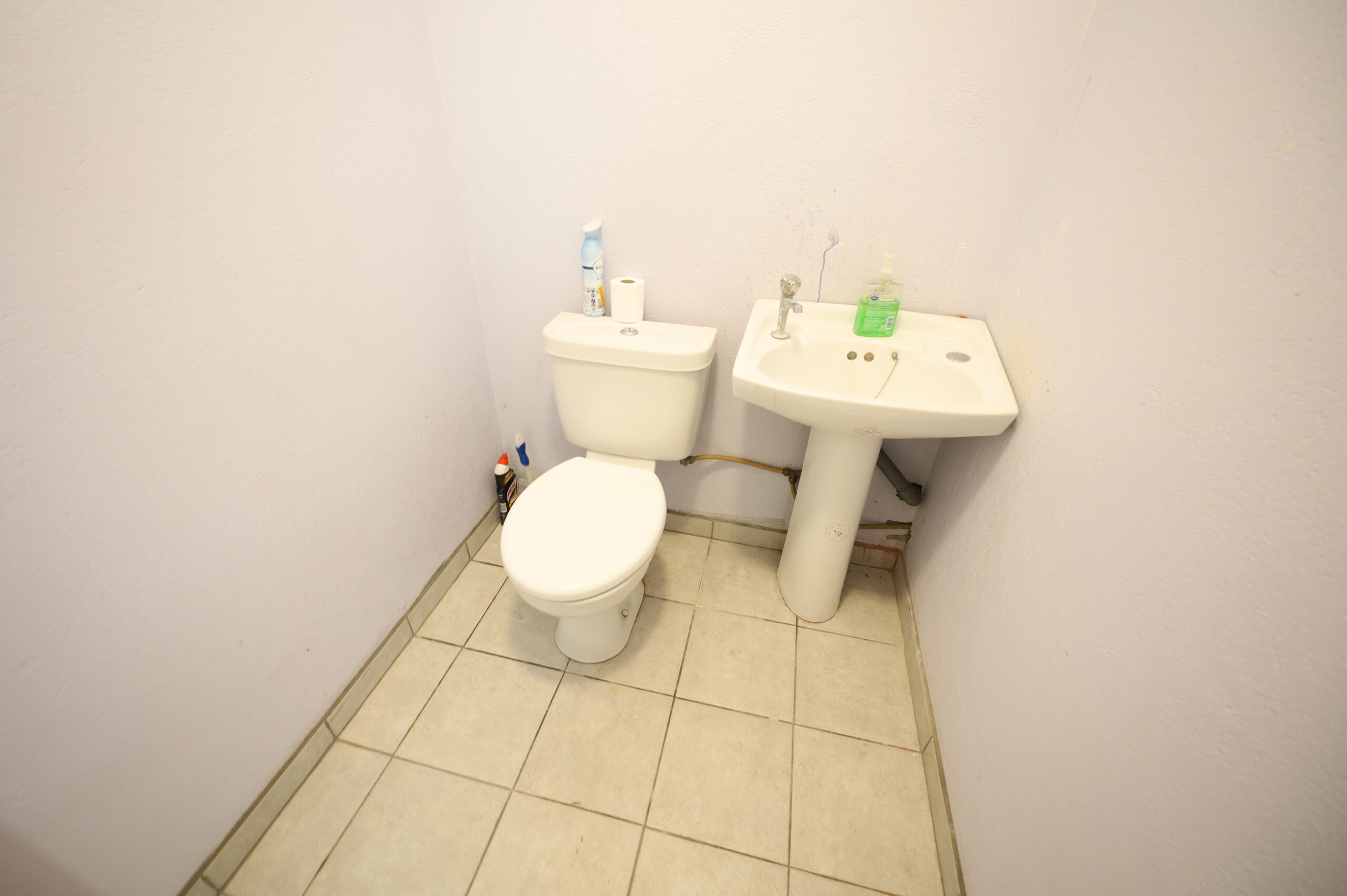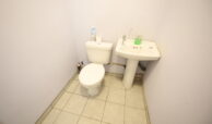 W.C. with tiled floor, white suite of dual flush toilet, wash hand basin and pedestal.