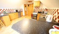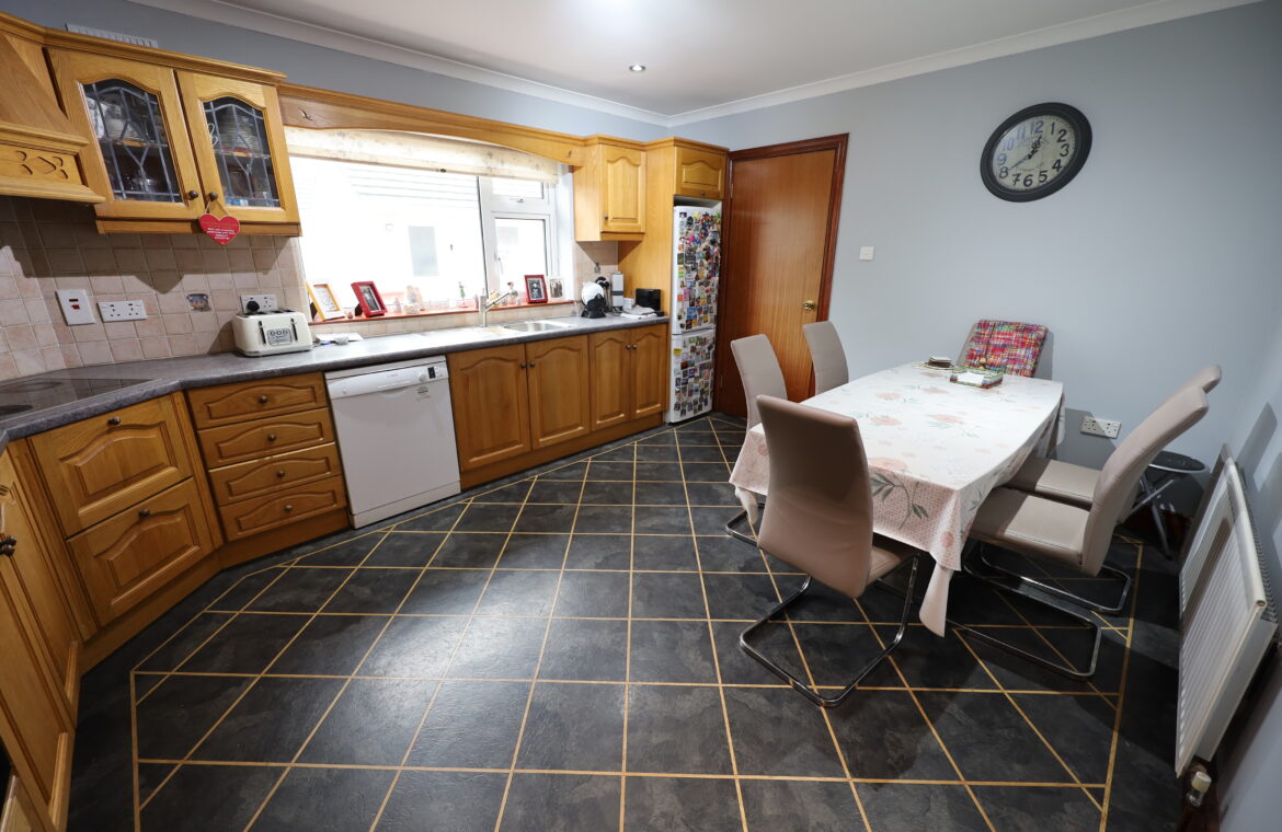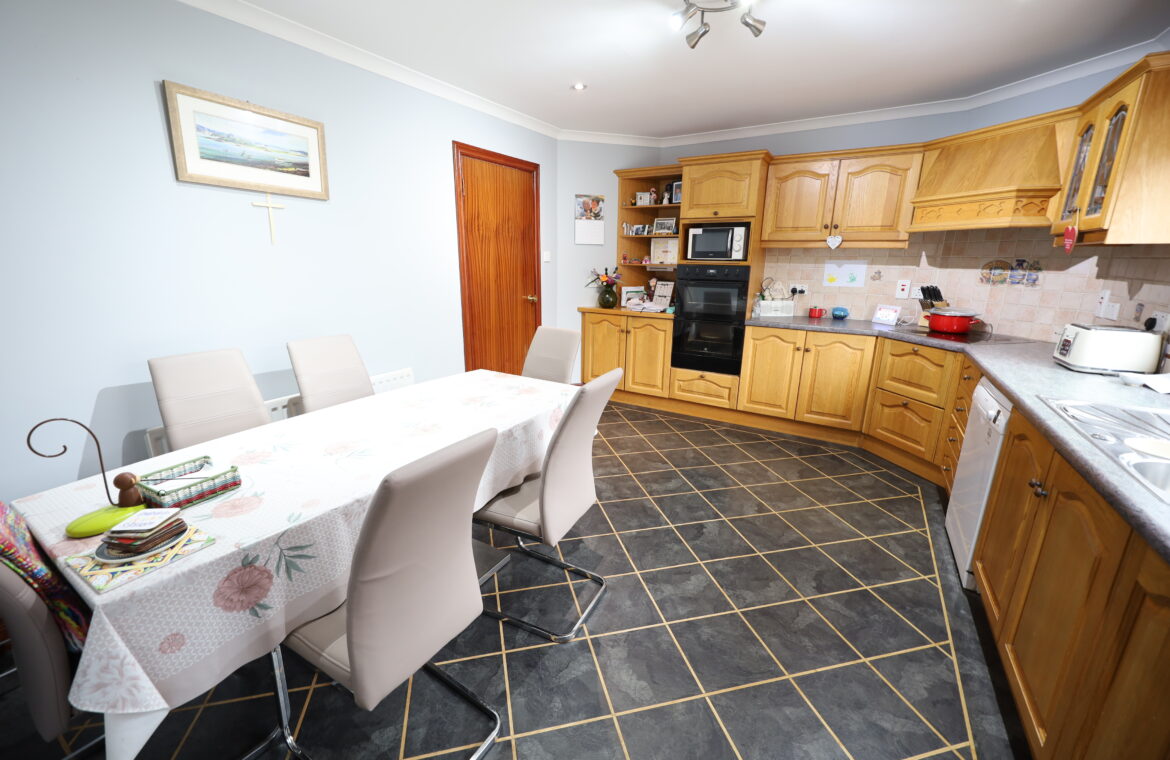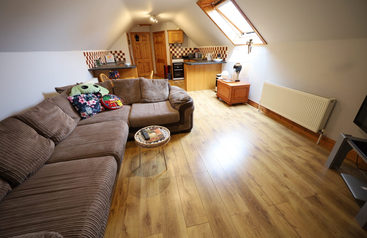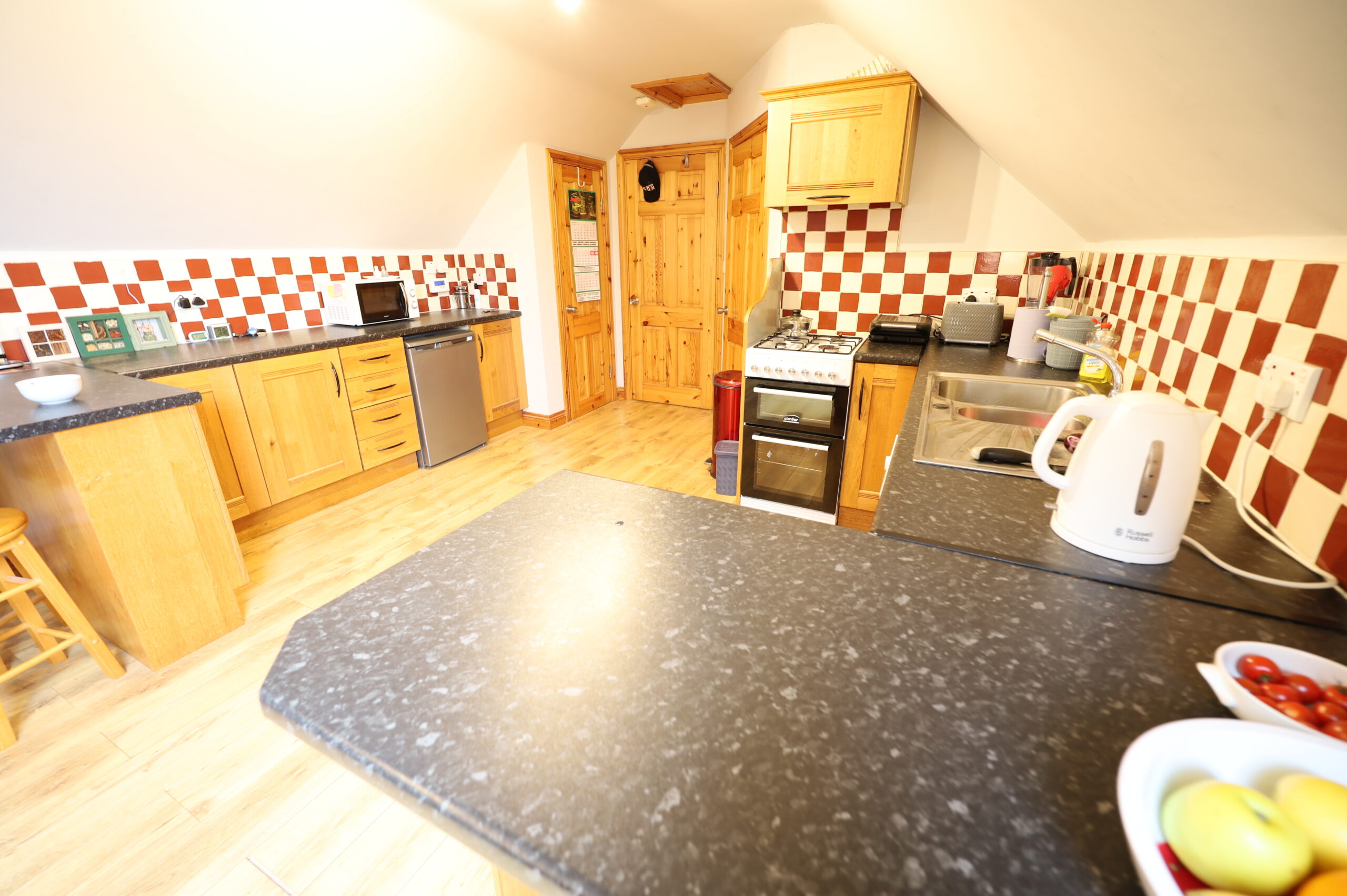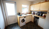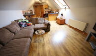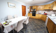Quality oak laminate flooring throughout. Extensive array of built in fitted units, breakfast island, under counter fridge, bowl and a half stainless steel sink, tiling over worktop. Velux roof light.