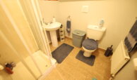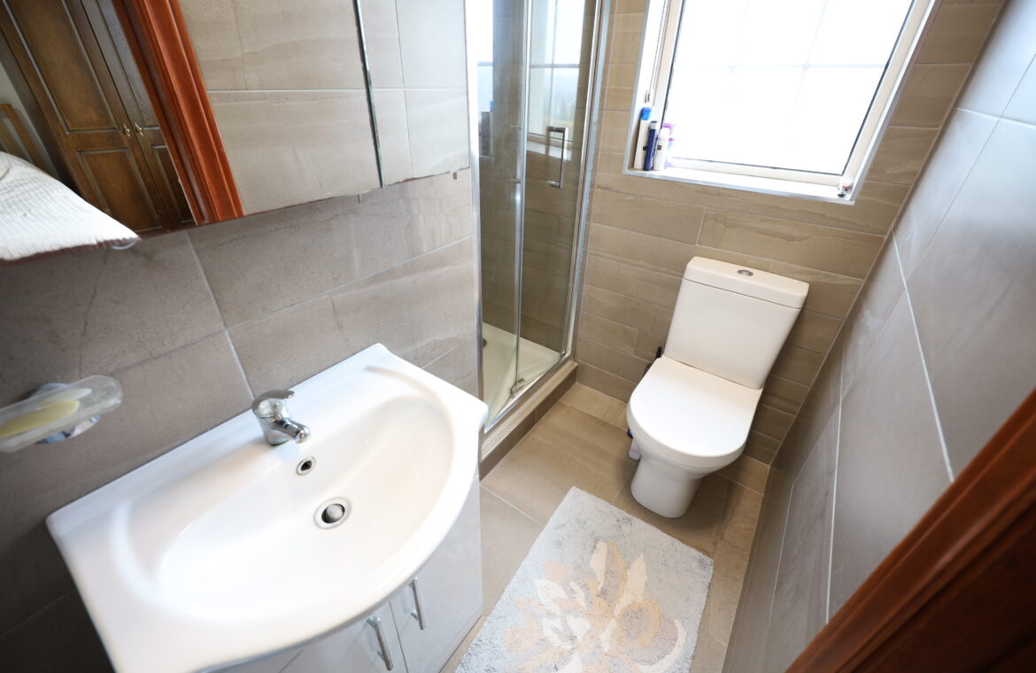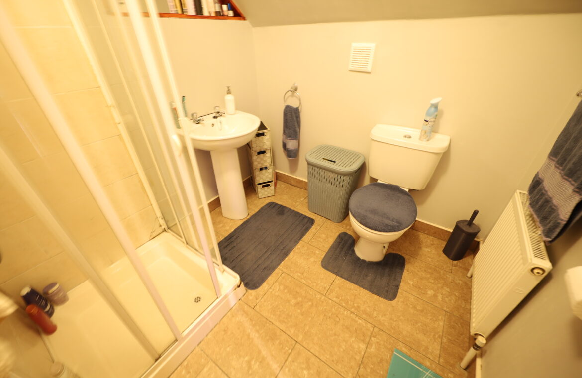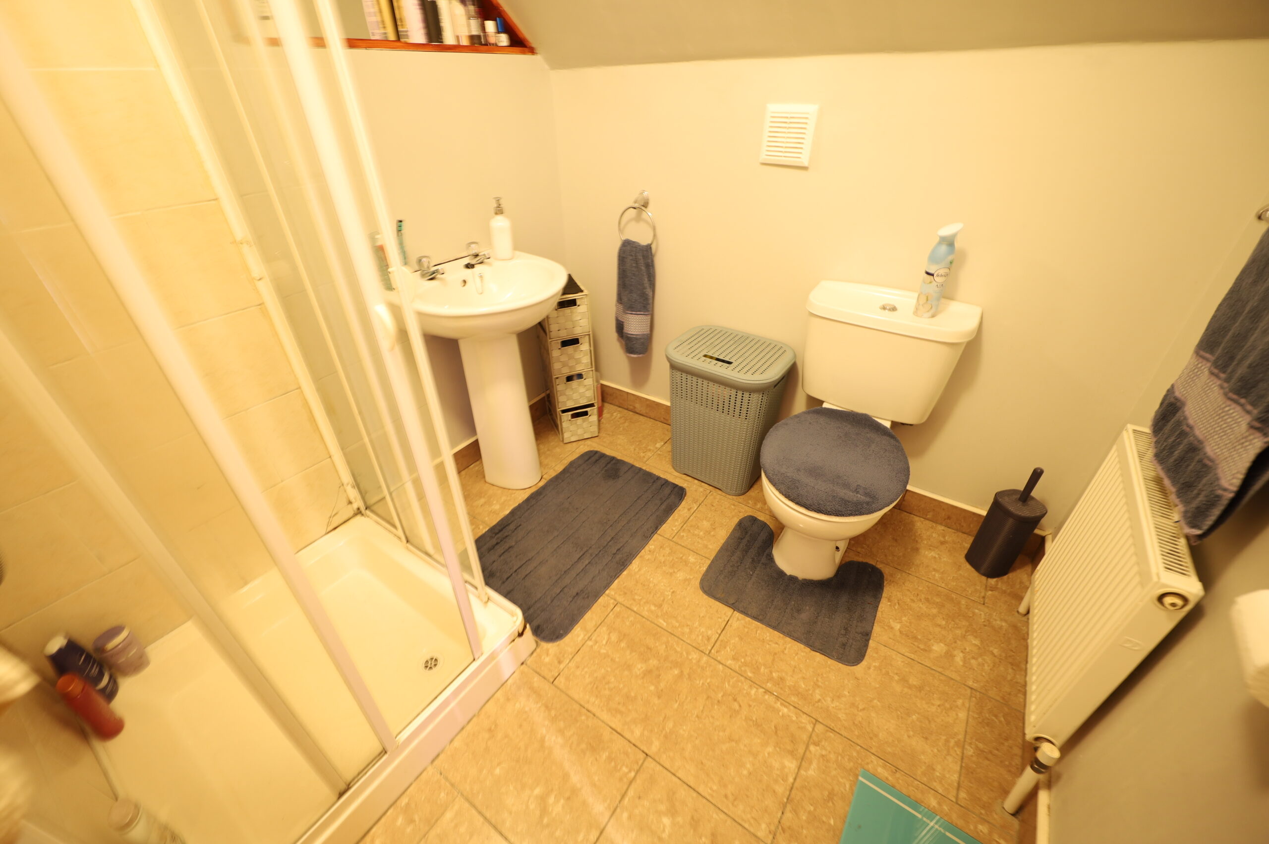 Tiled floor. White suite of dual flush toilet, wash hand basin and pedestal. Shower enclosure with glass sliding doors, mains shower fitting.